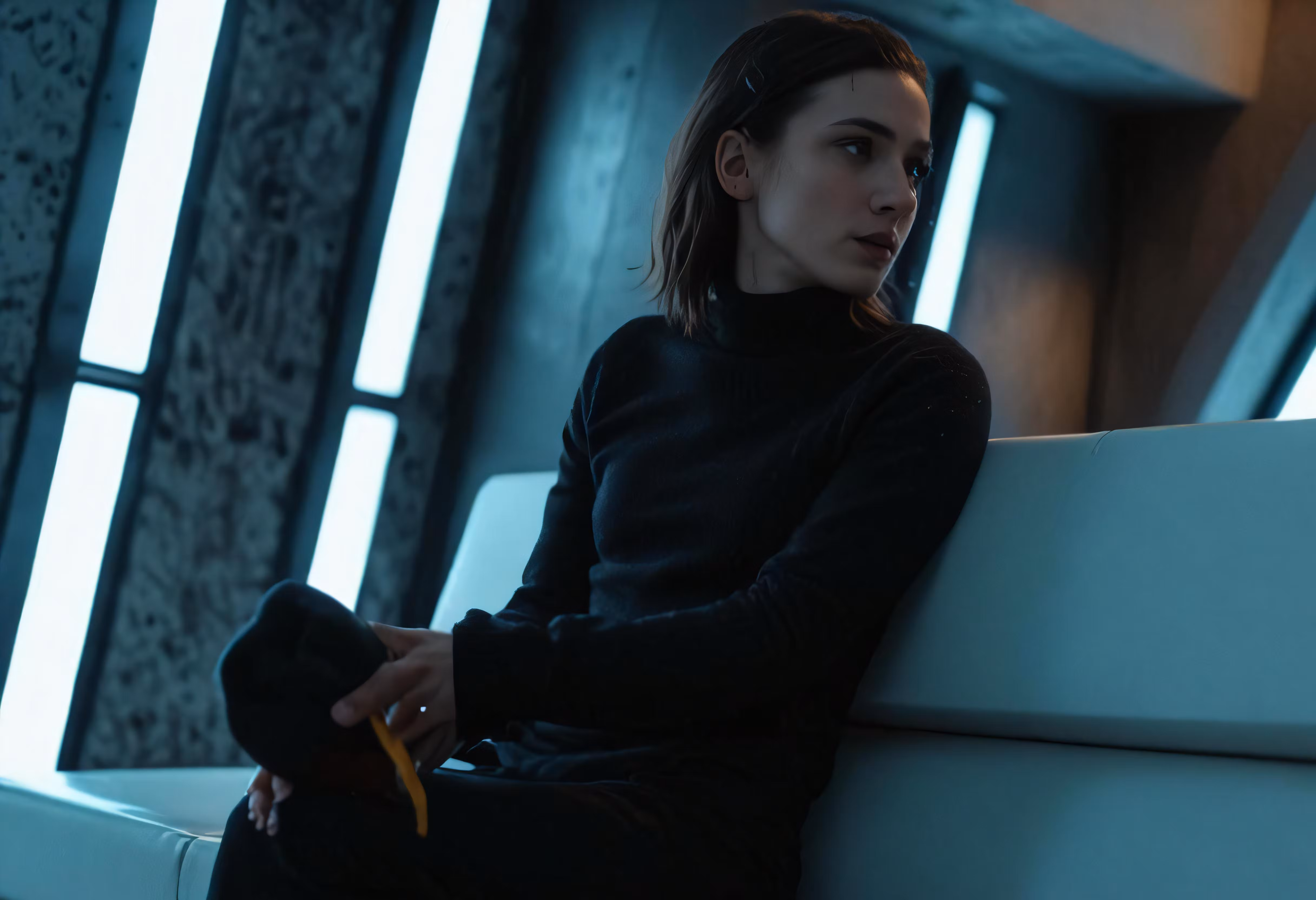 High resolution picture, free to use, the beautiful woman is sitting on a white sofa