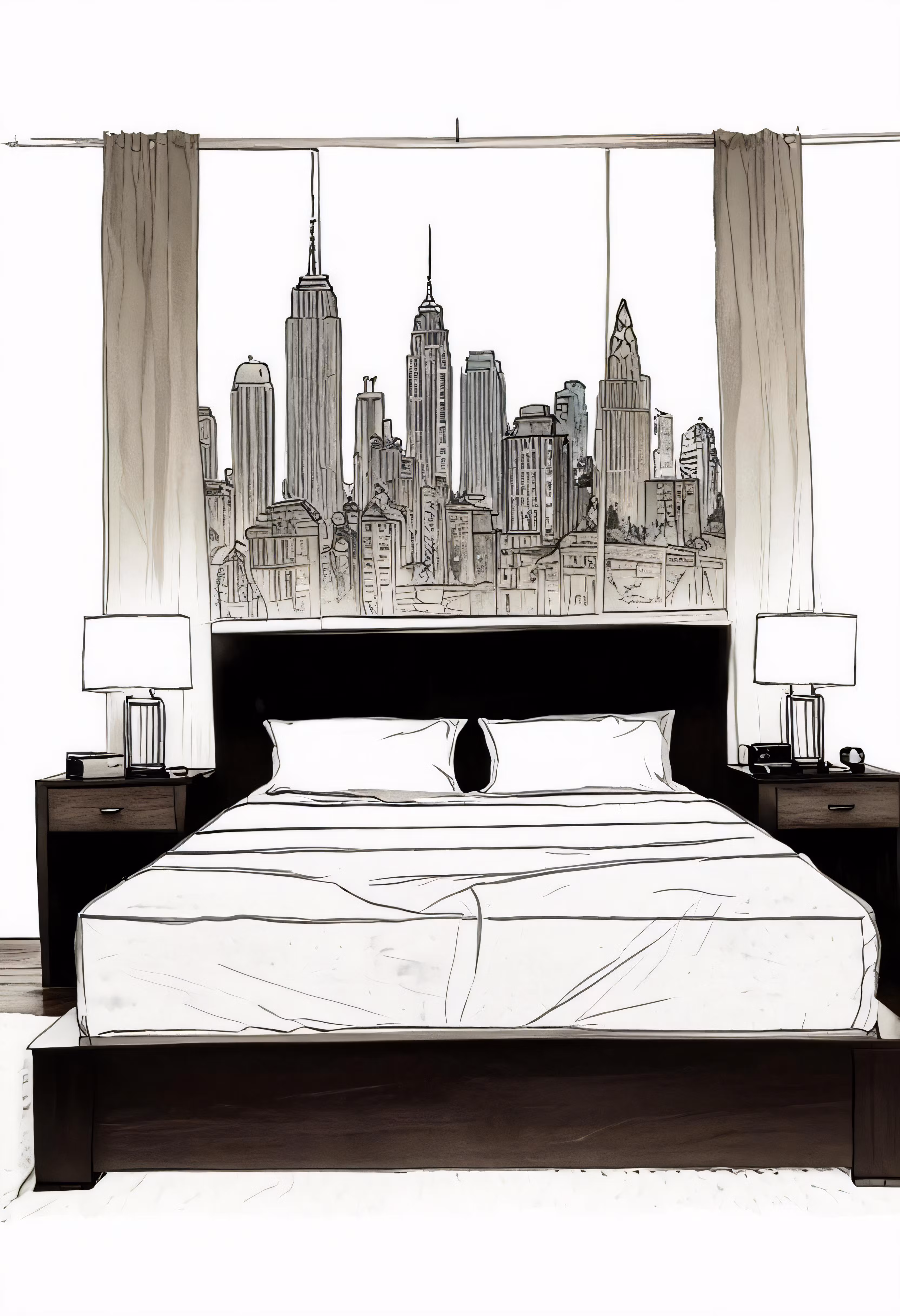 High resolution picture, free to use, the bed is in front of a window with cityscape on it