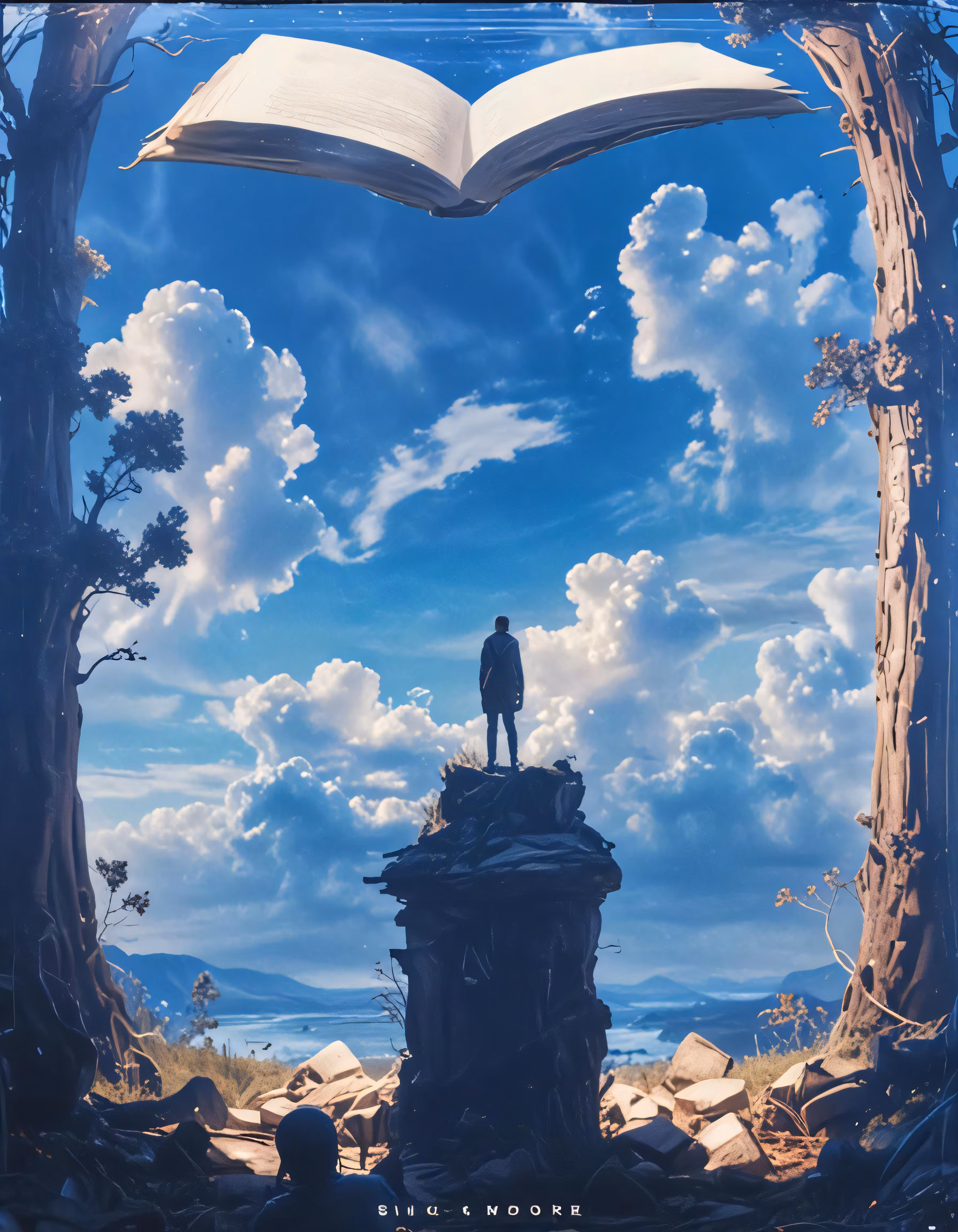 High resolution picture, free to use, the book cover is open and shows an illustration of a person standing on top of a large book
