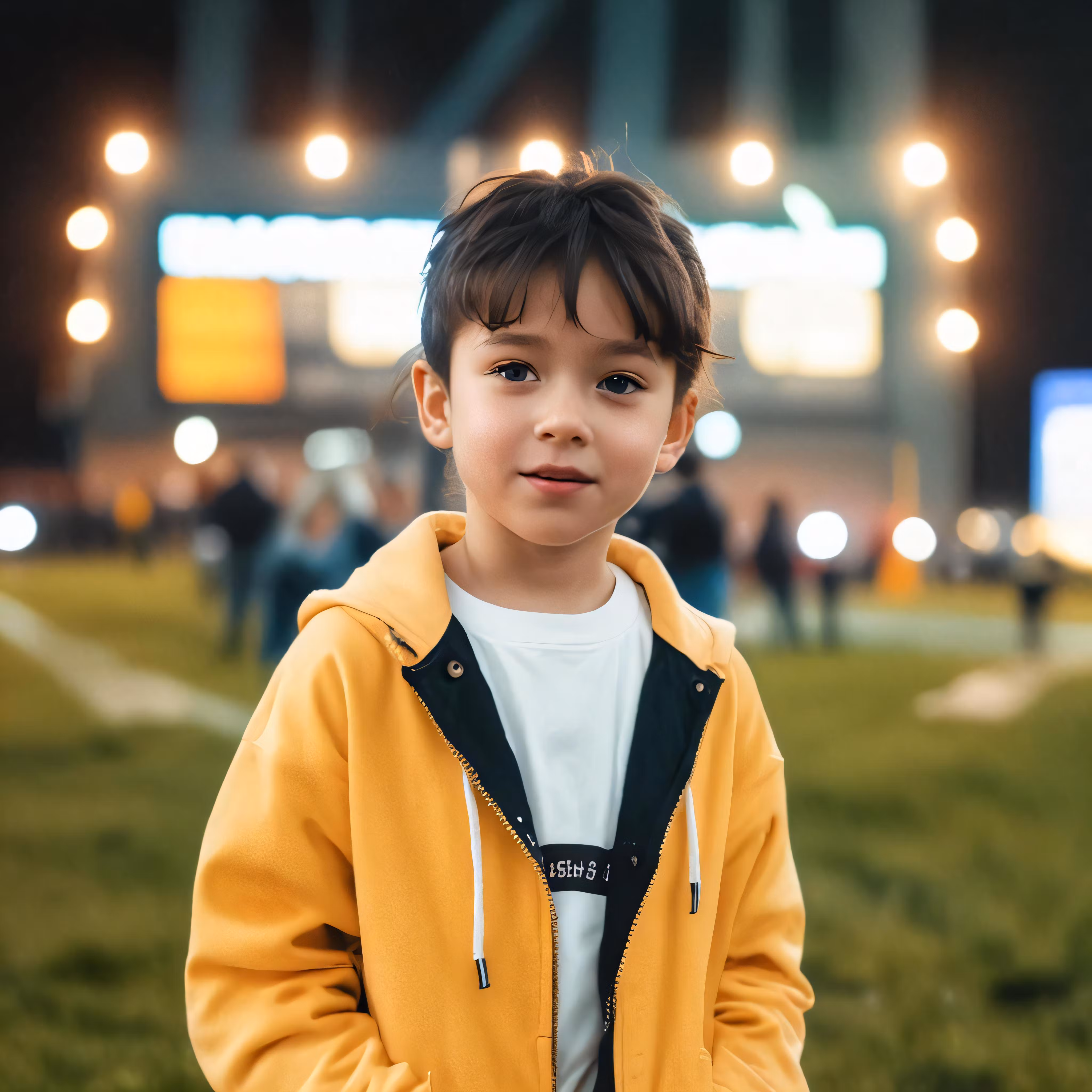 High resolution picture, free to use, the boy is wearing a yellow jacket in front of a large crowd