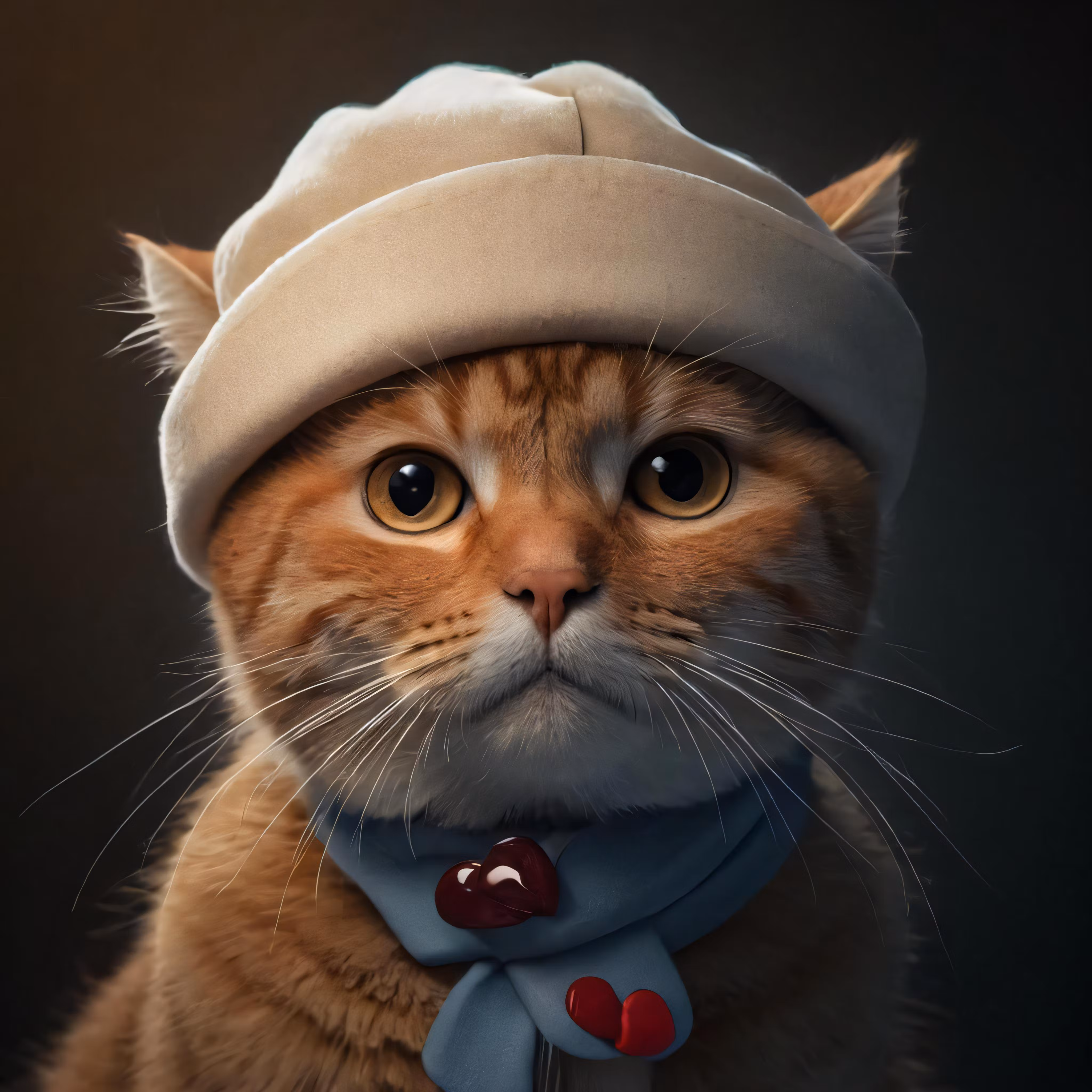 High resolution picture, free to use, the cat is dressed in an unusual looking hat and scarf