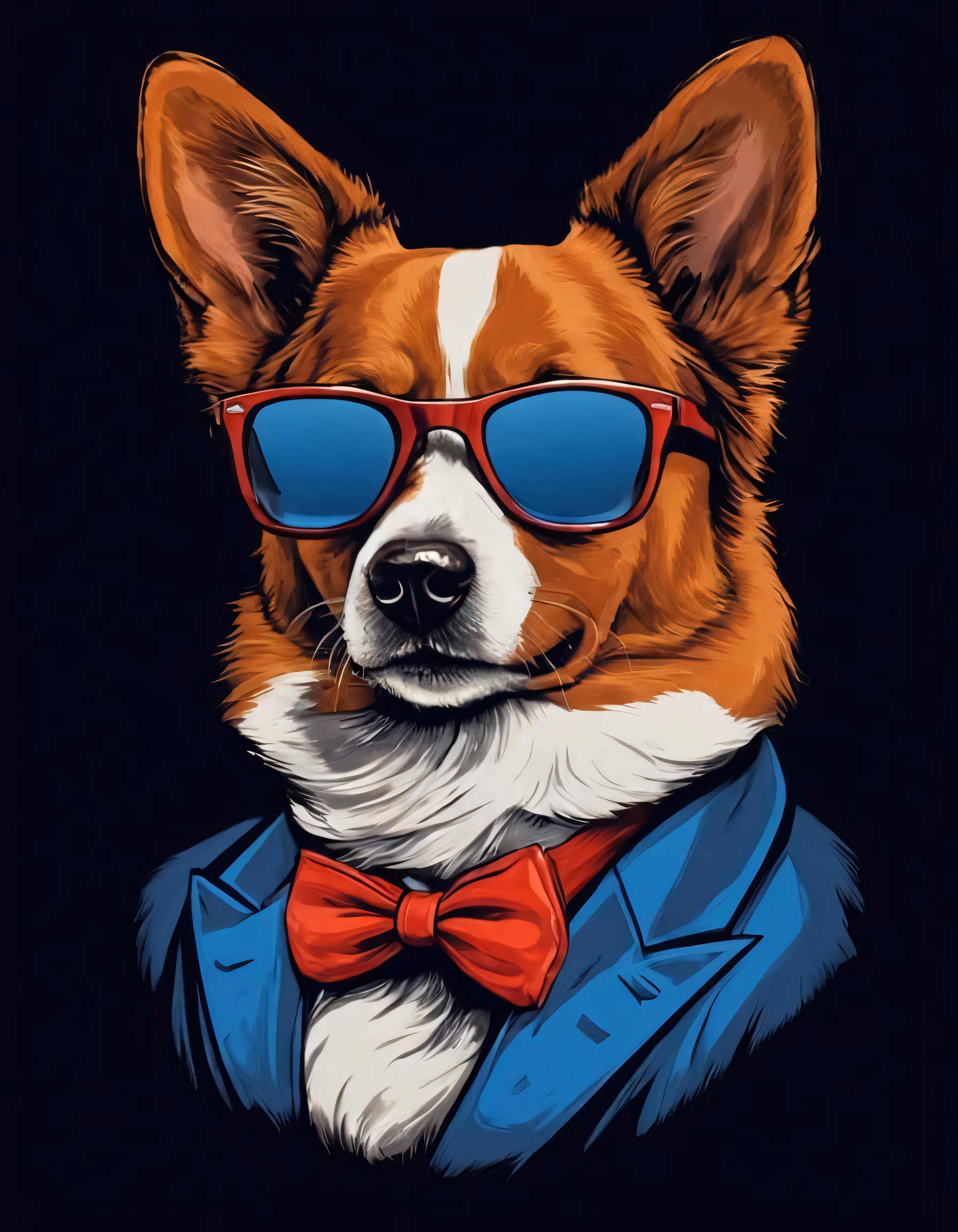High resolution picture, free to use, the corgi wearing red sunglasses and a blue jacket