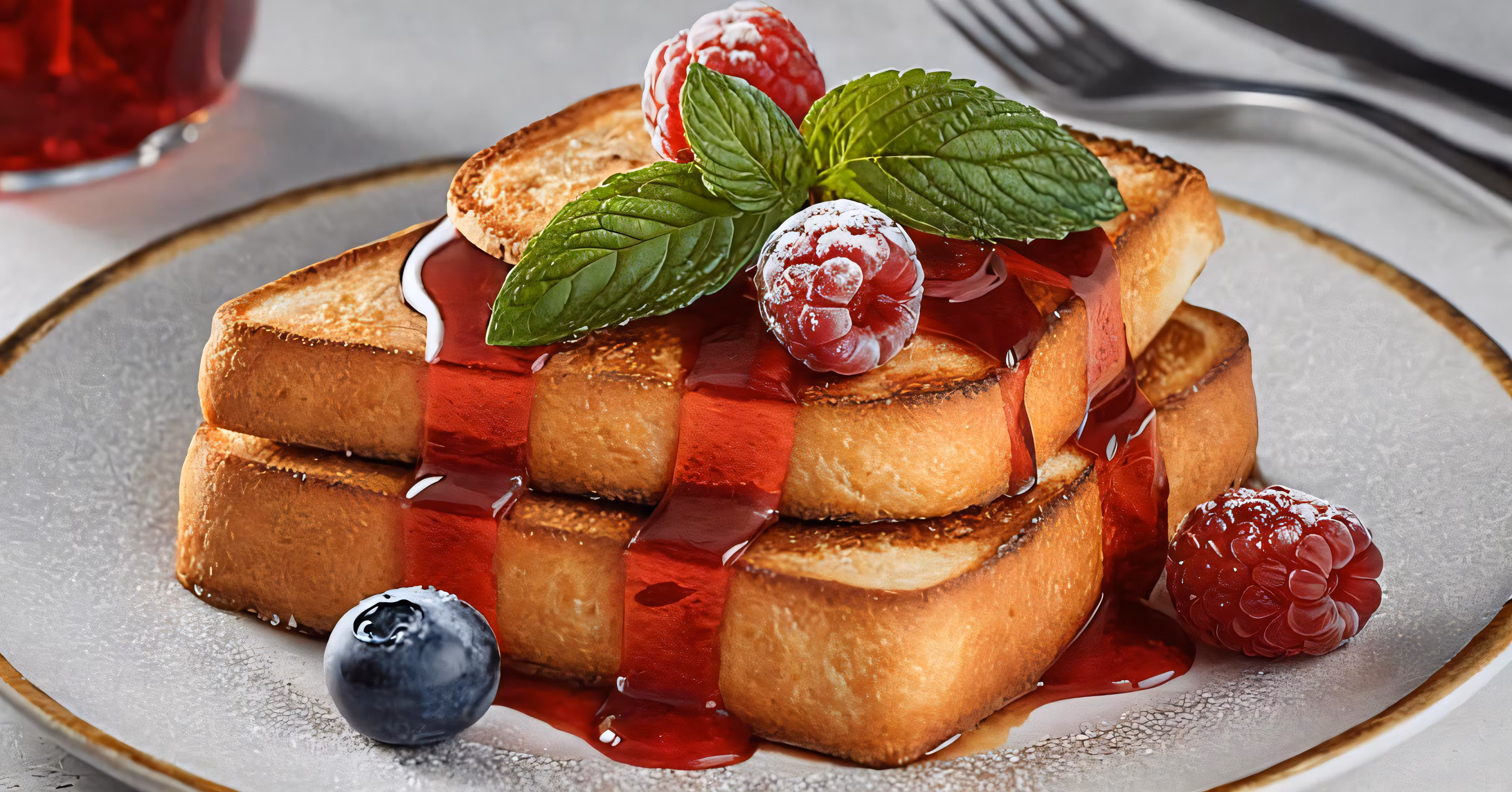 High resolution picture, free to use, the dessert is made up of two pieces of french toast and blueberries