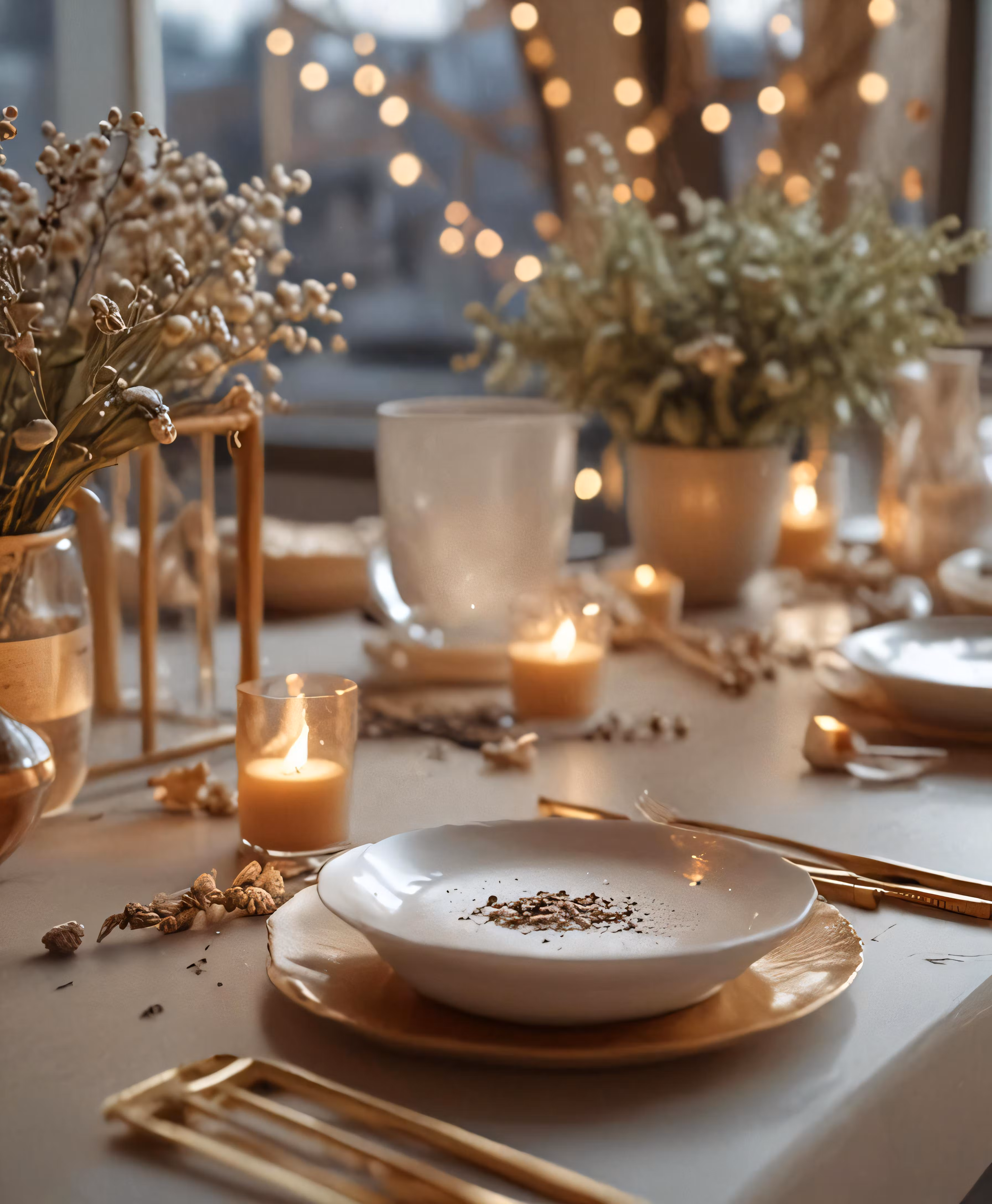 High resolution picture, free to use, the dining table has gold utensils in front of a large window with white lights