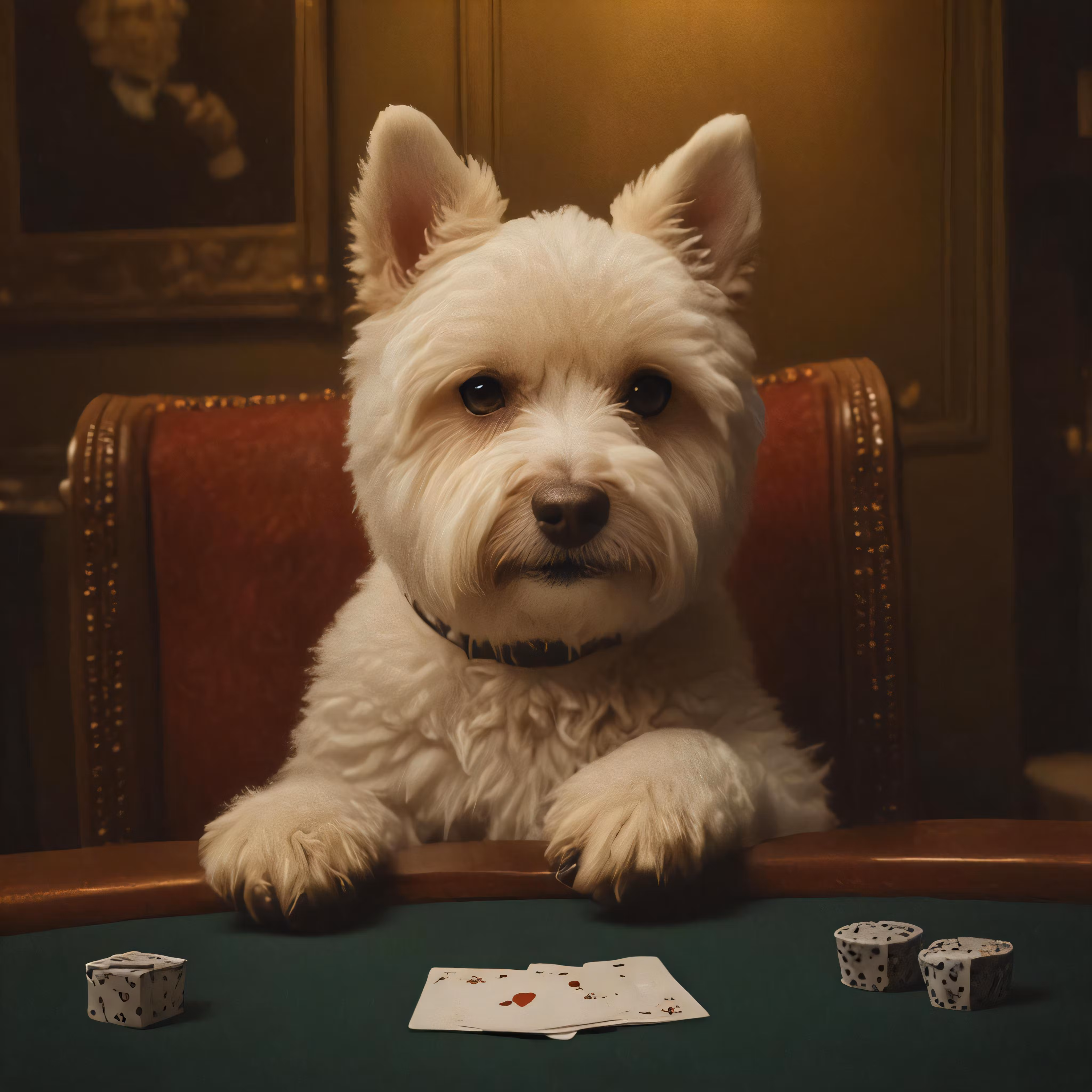 High resolution picture, free to use, the dog is sitting at the table next to cards