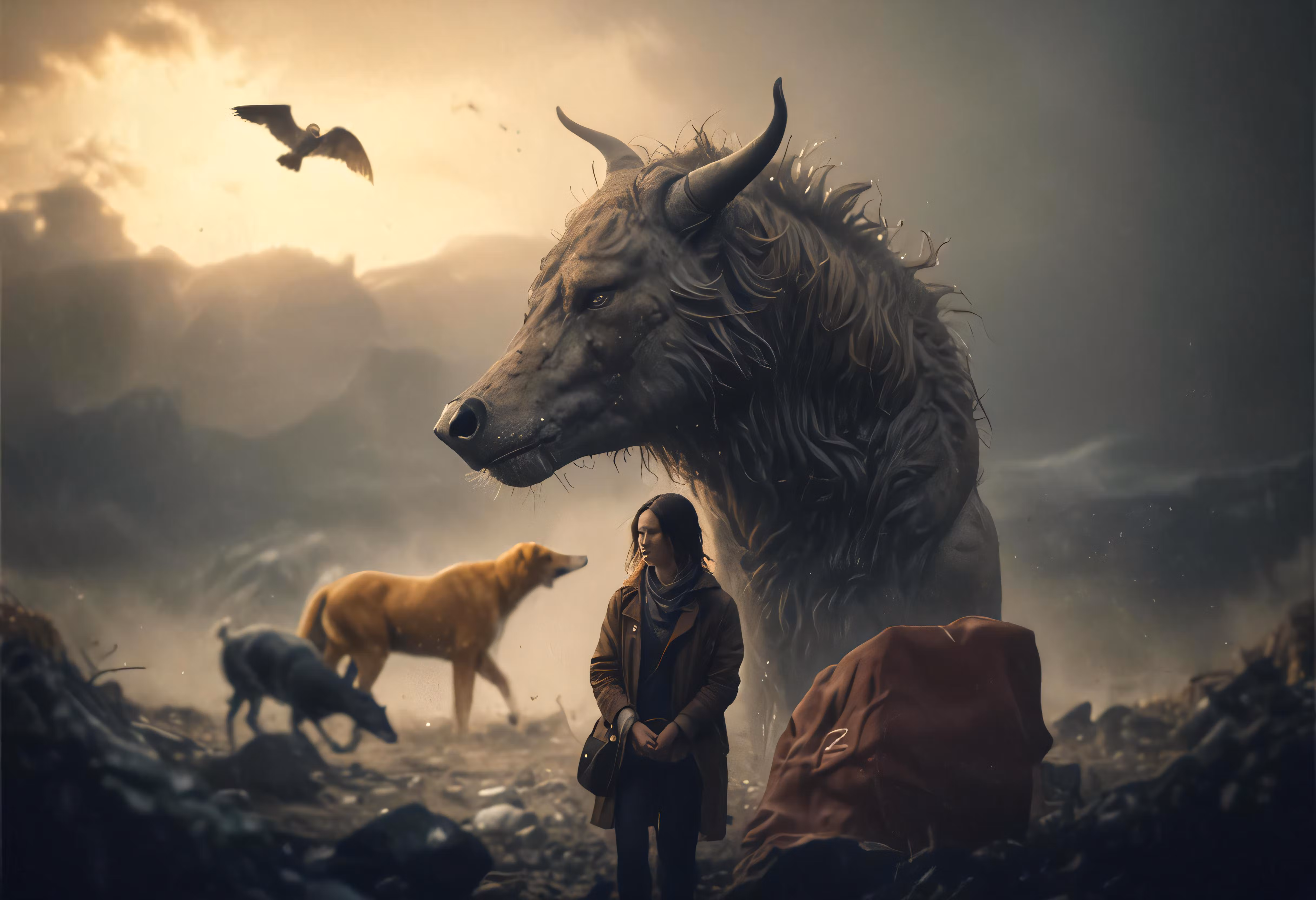 High resolution picture, free to use, the dog is walking towards a woman with long horns