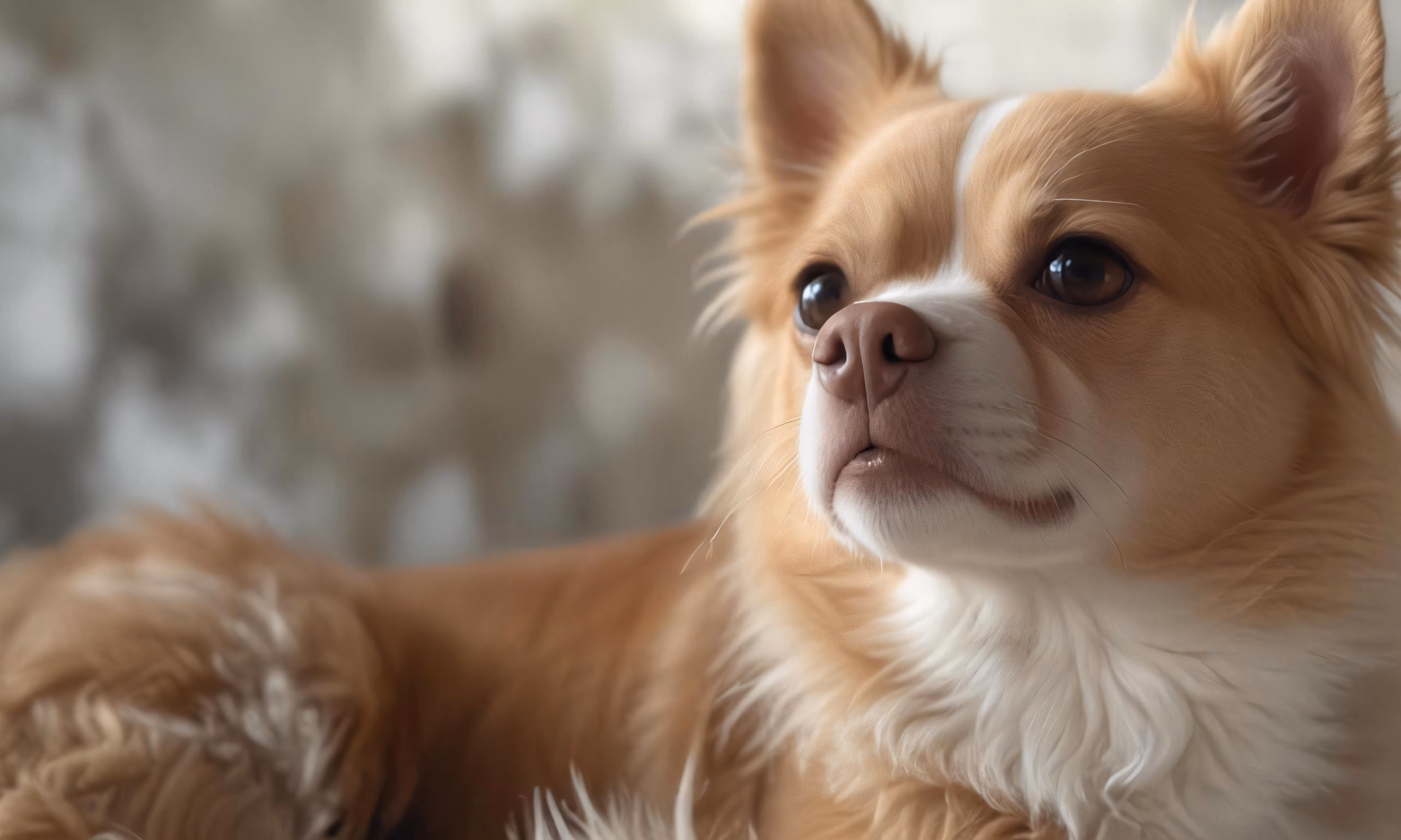 High resolution picture, free to use, the dog is wearing big fluffy ears and looks to its left