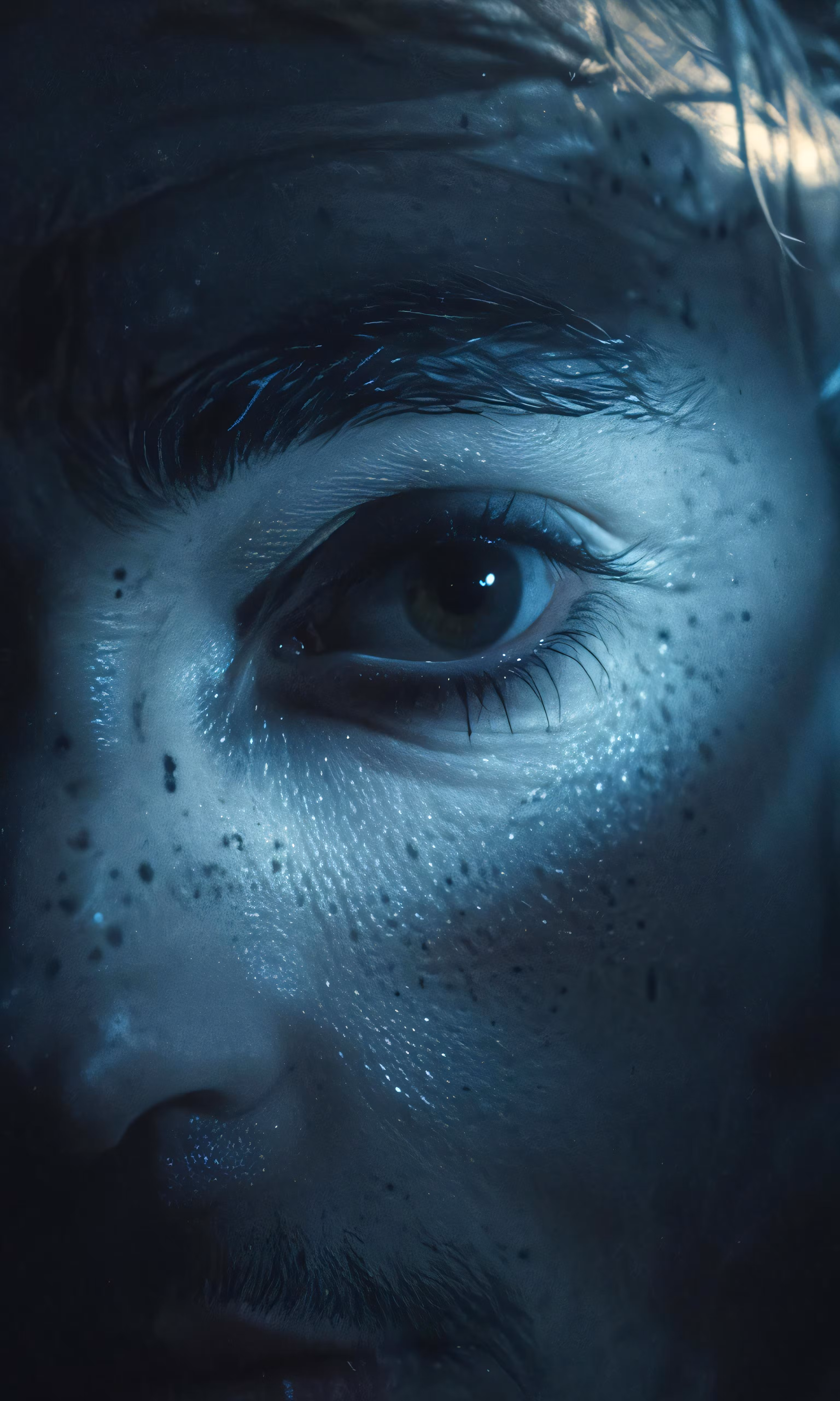 High resolution picture, free to use, the eyes and face of an alien alien looking man with freckled hair