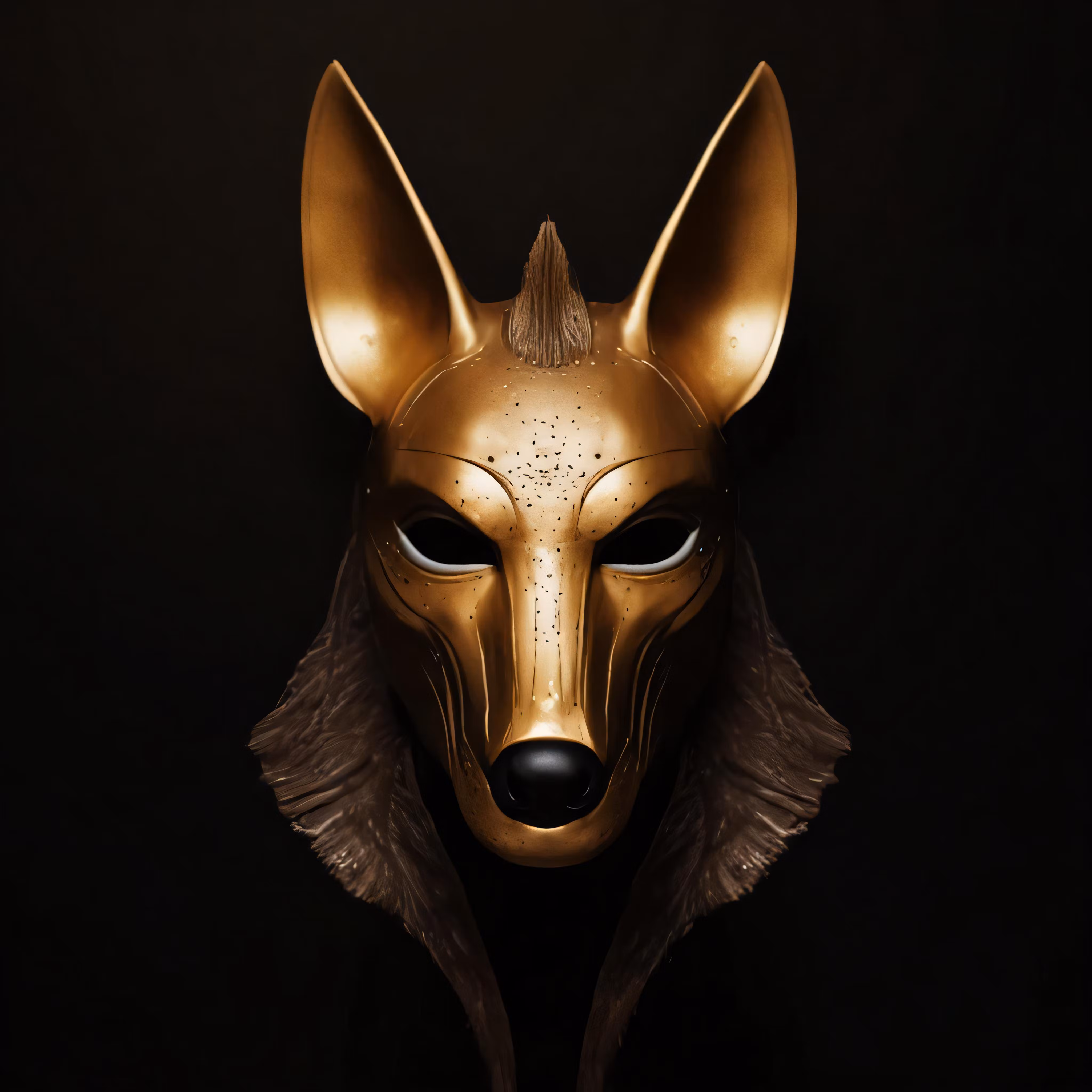 High resolution picture, free to use, the face of a fox wearing gold is on a black background