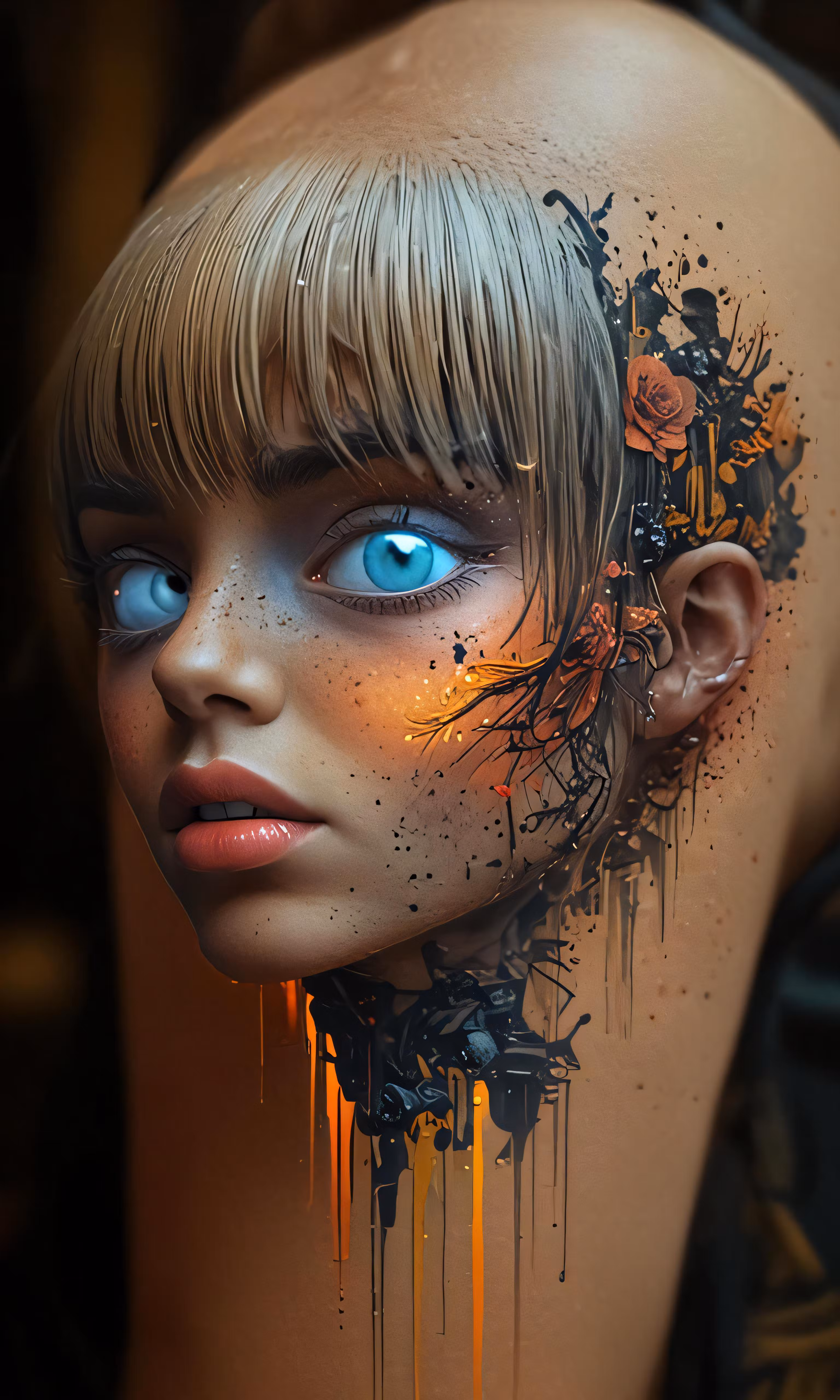 High resolution picture, free to use, the face of a woman with splatters and flowers on her chest