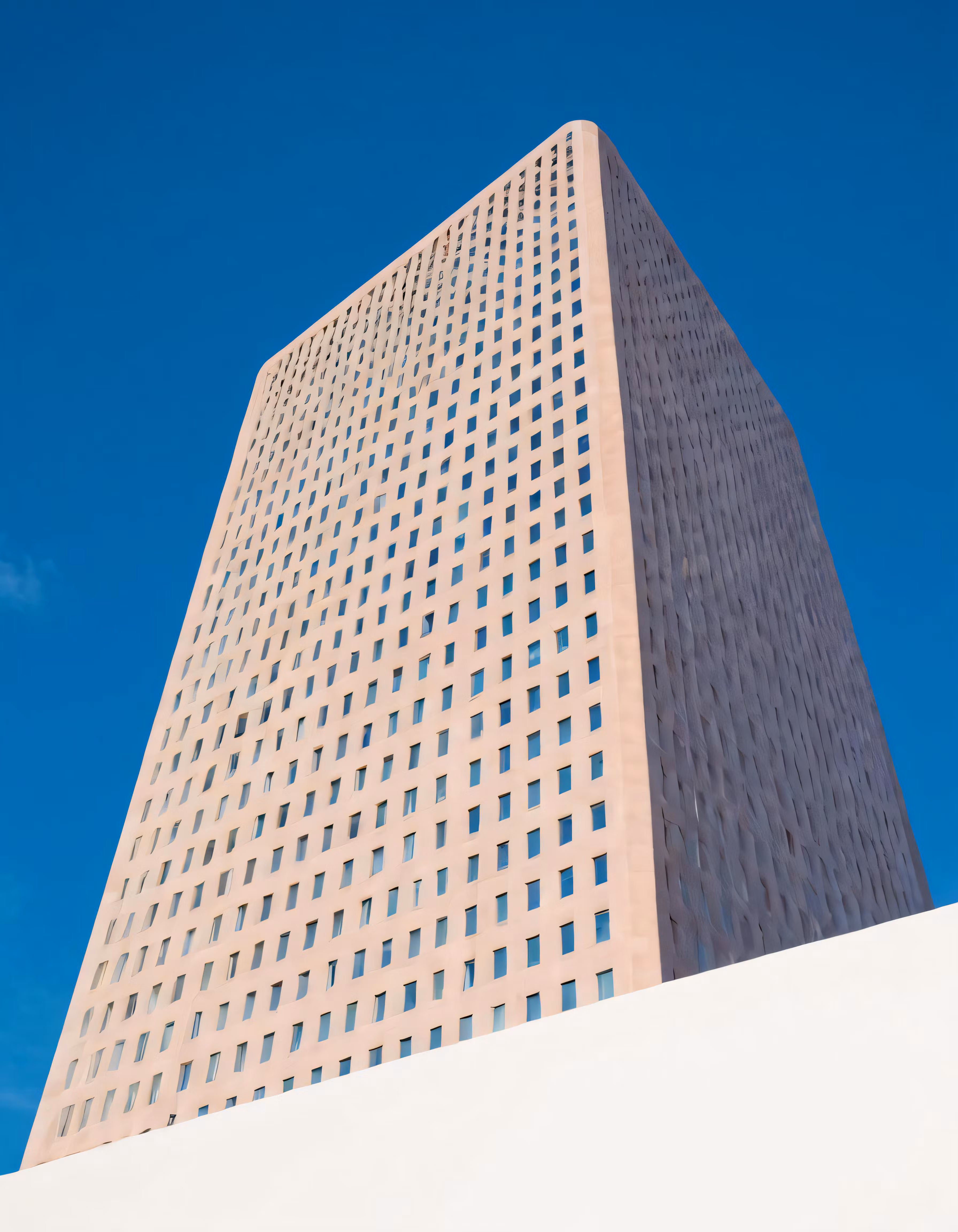 High resolution picture, free to use, the face of an building rises in the blue sky