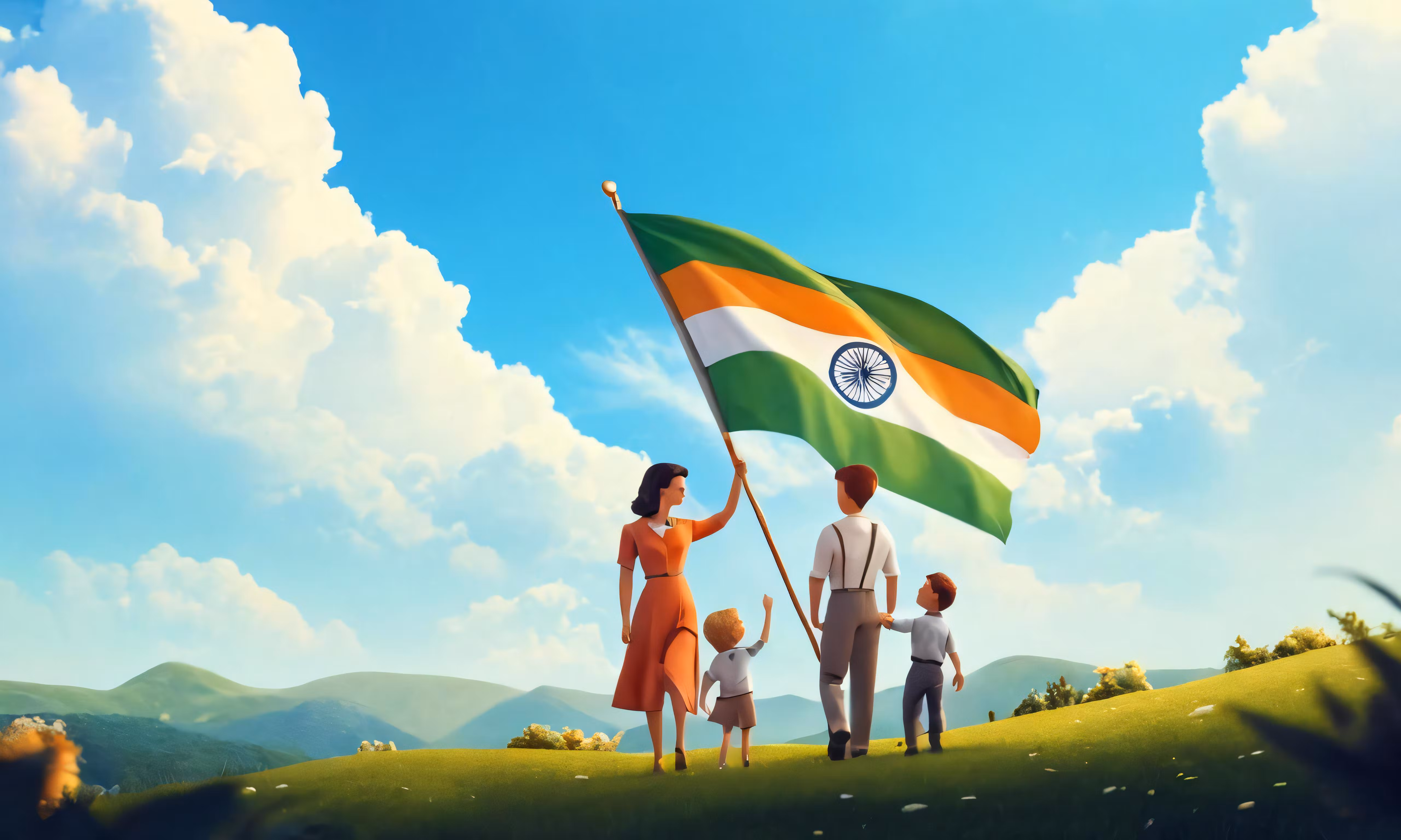 High resolution picture, free to use, the family holding the flag is waving the india flag