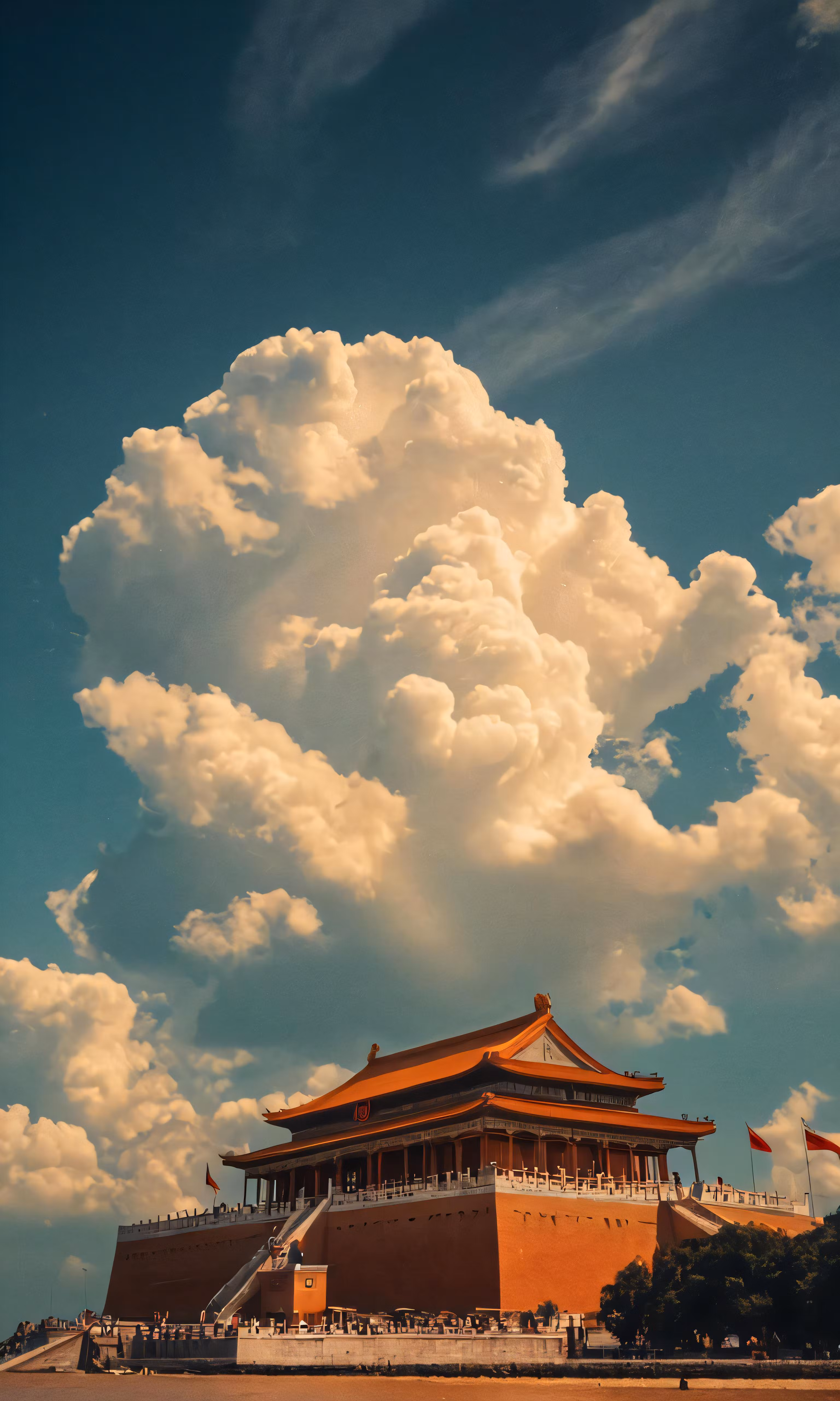 High resolution picture, free to use, the forbidden city under an enormous, cloud filled sky