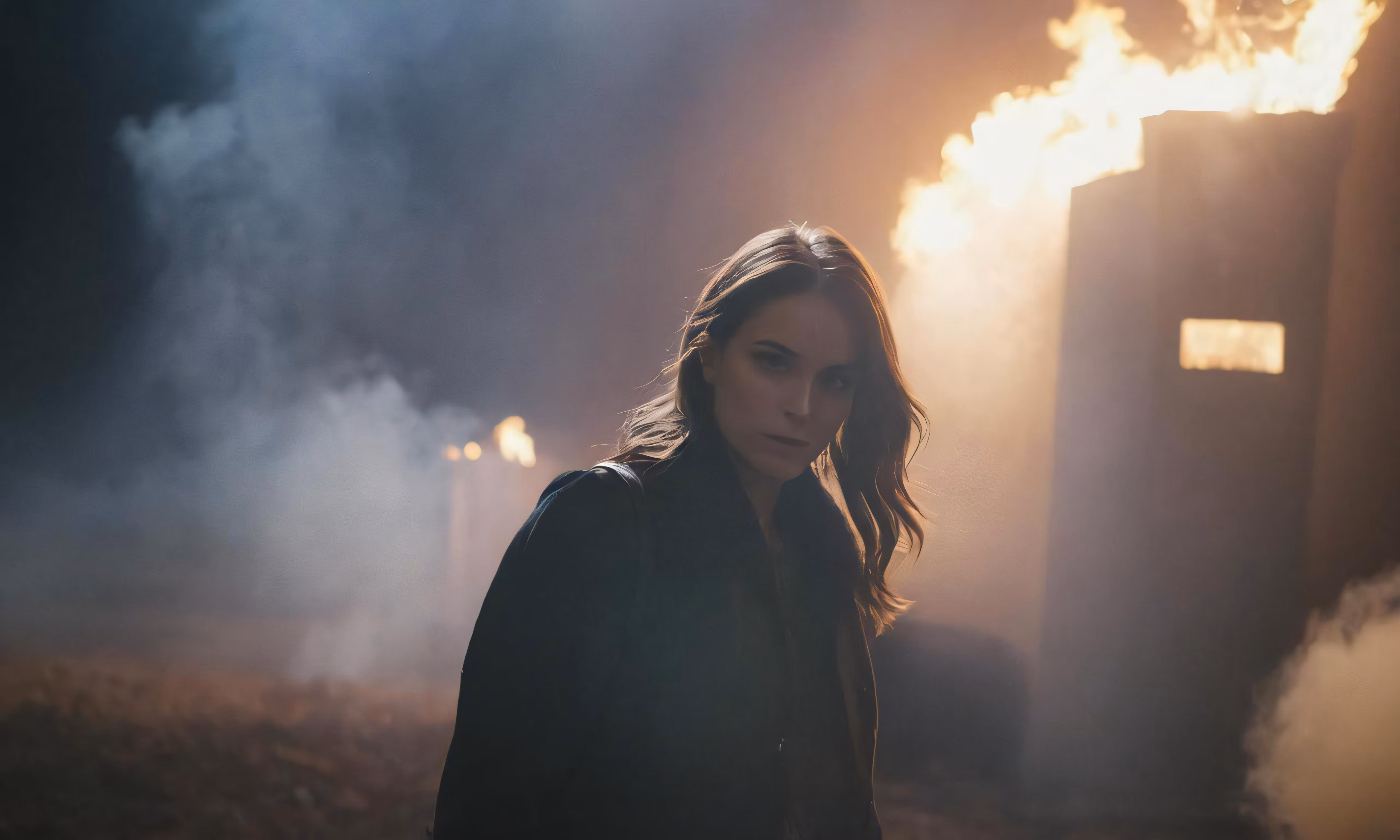 High resolution picture, free to use, the girl looks back at the camera as she stands in front of a fire