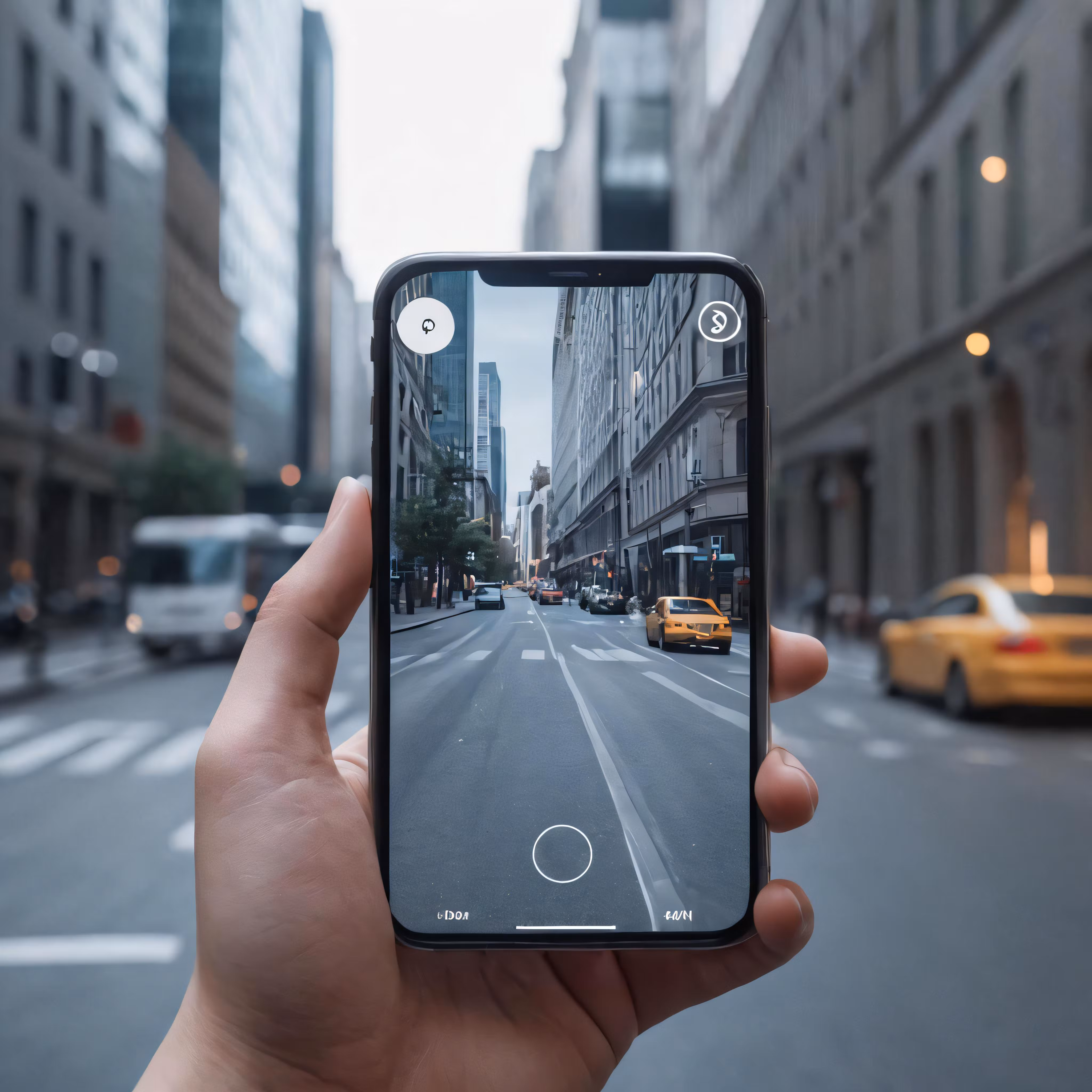 High resolution picture, free to use, the hand holding a cell phone is holding the camera, showing a city street with many taxis on it
