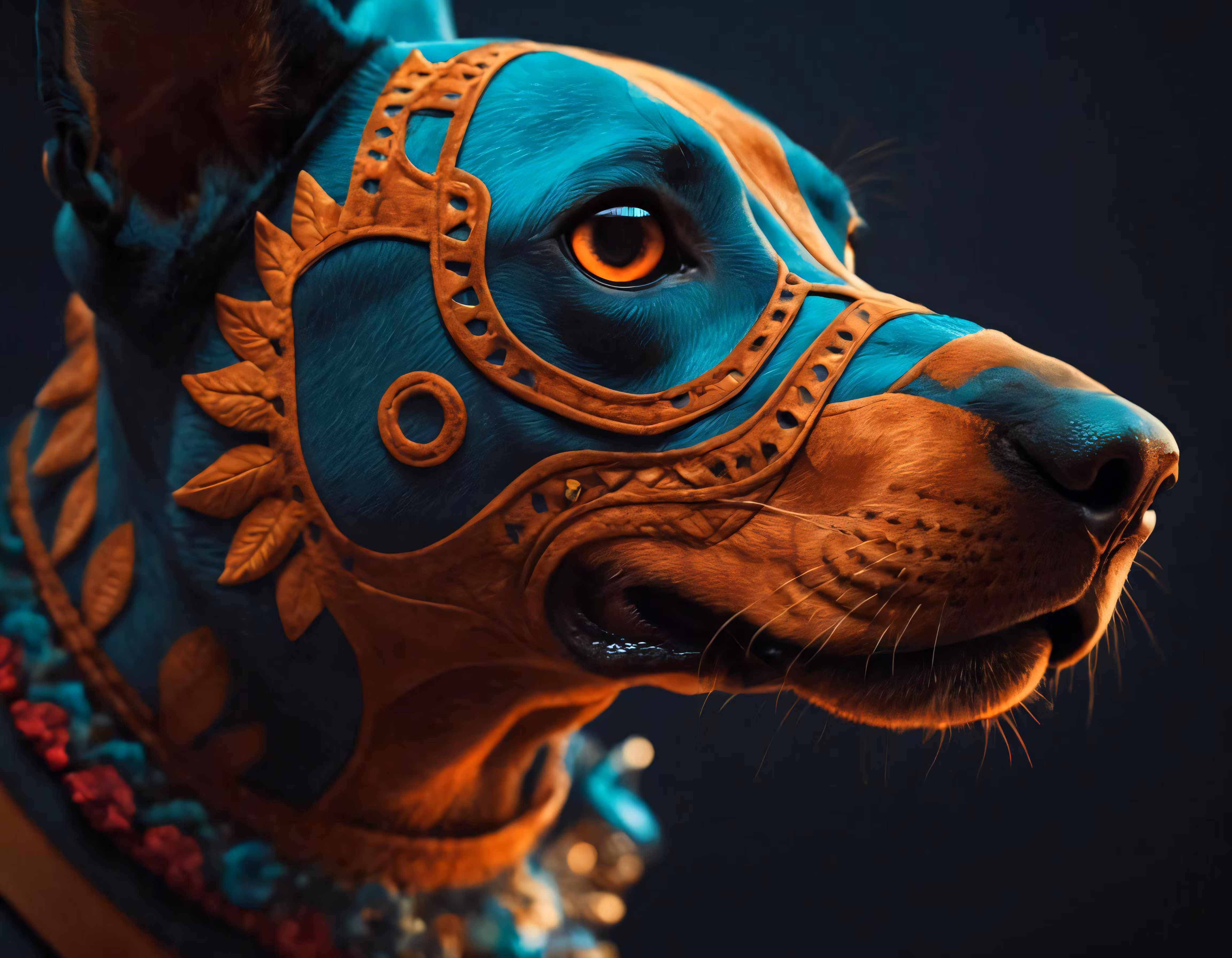 High resolution picture, free to use, the head of a dog that has bright blue and red paint