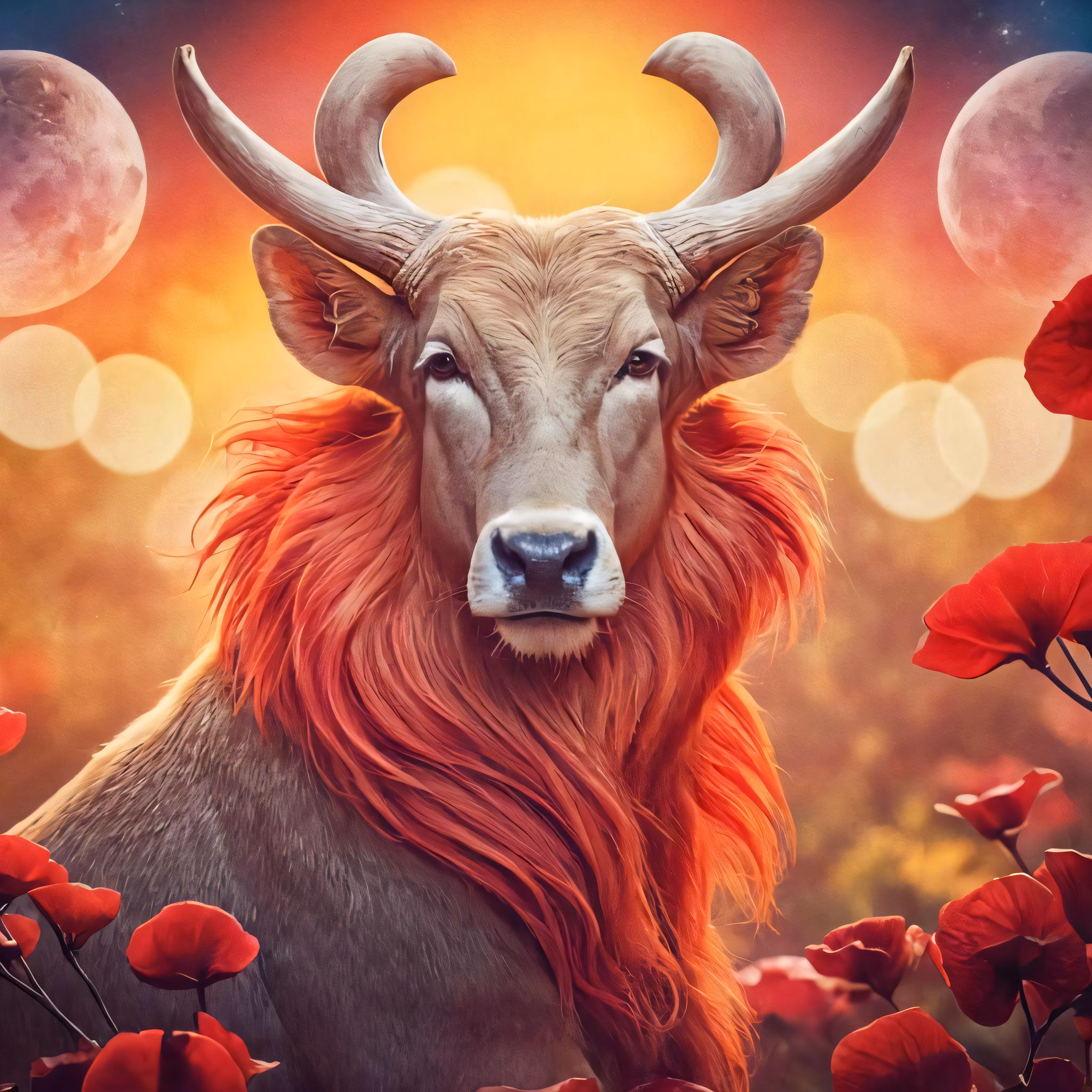High resolution picture, free to use, the horned animal with red mane is sitting in front of some red flowers