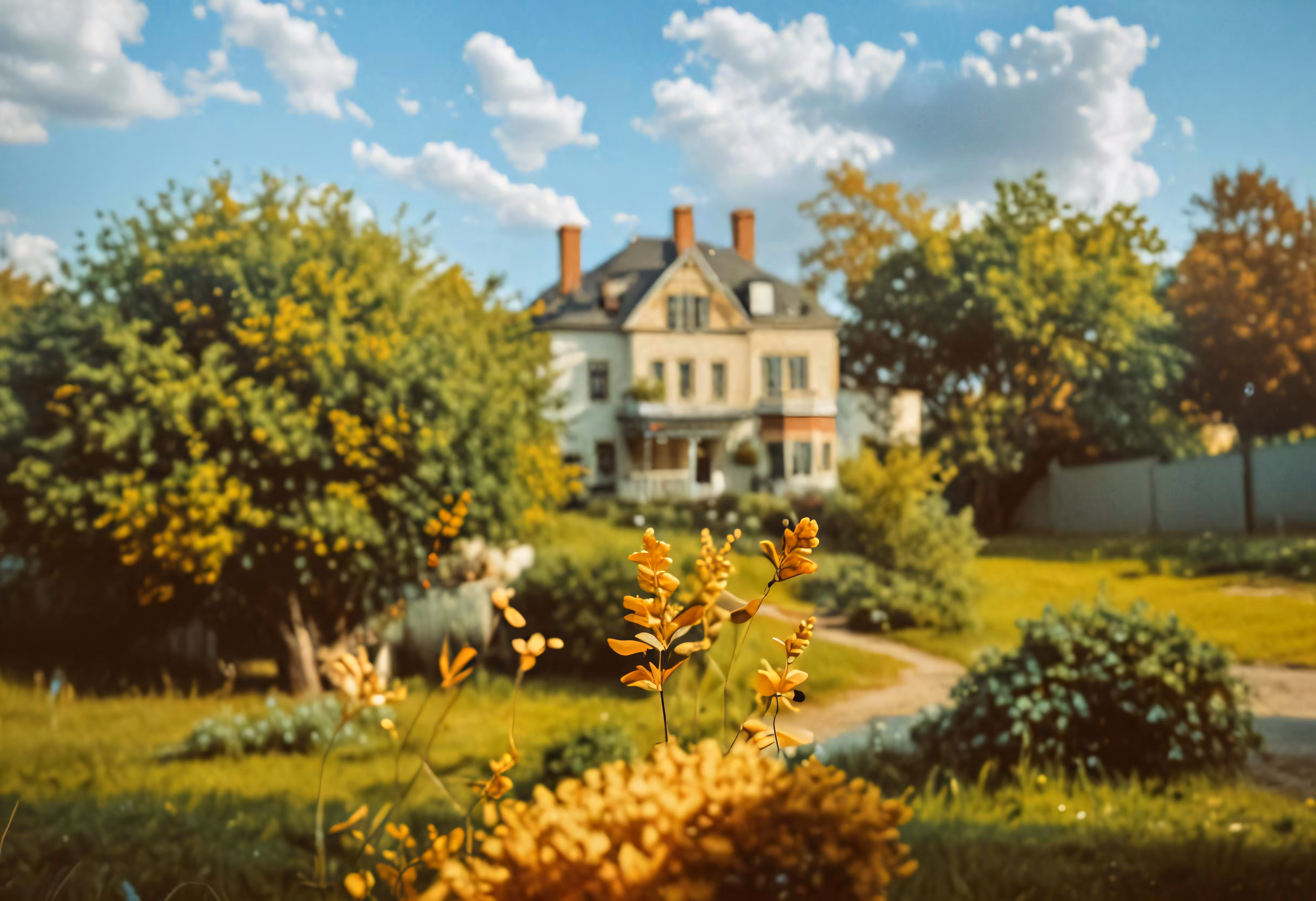 High resolution picture, free to use, the house has a large garden with yellow flowers in front of it