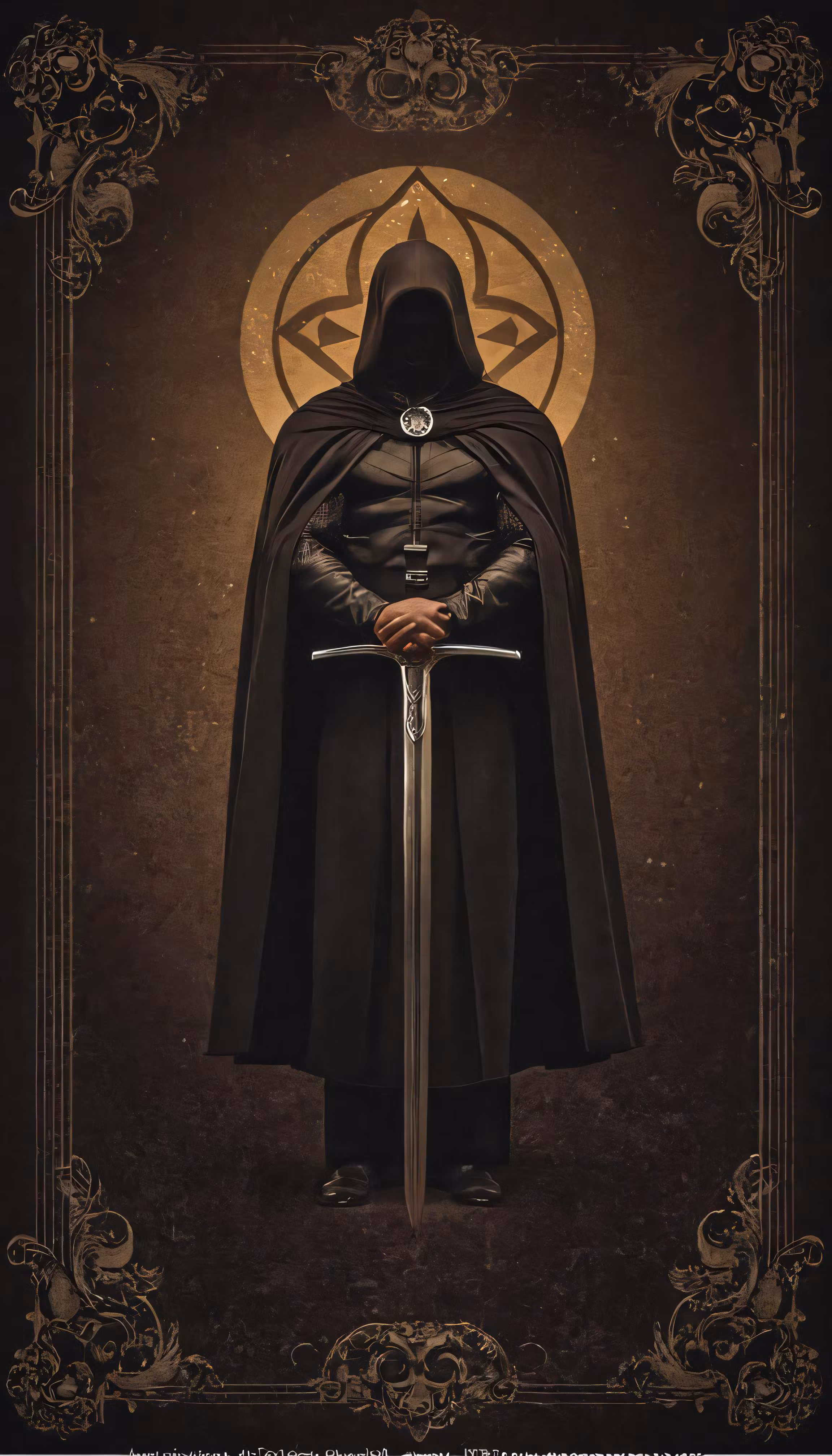 High resolution picture, free to use, the image has a portrait of a man wearing a dark cloak with a sword