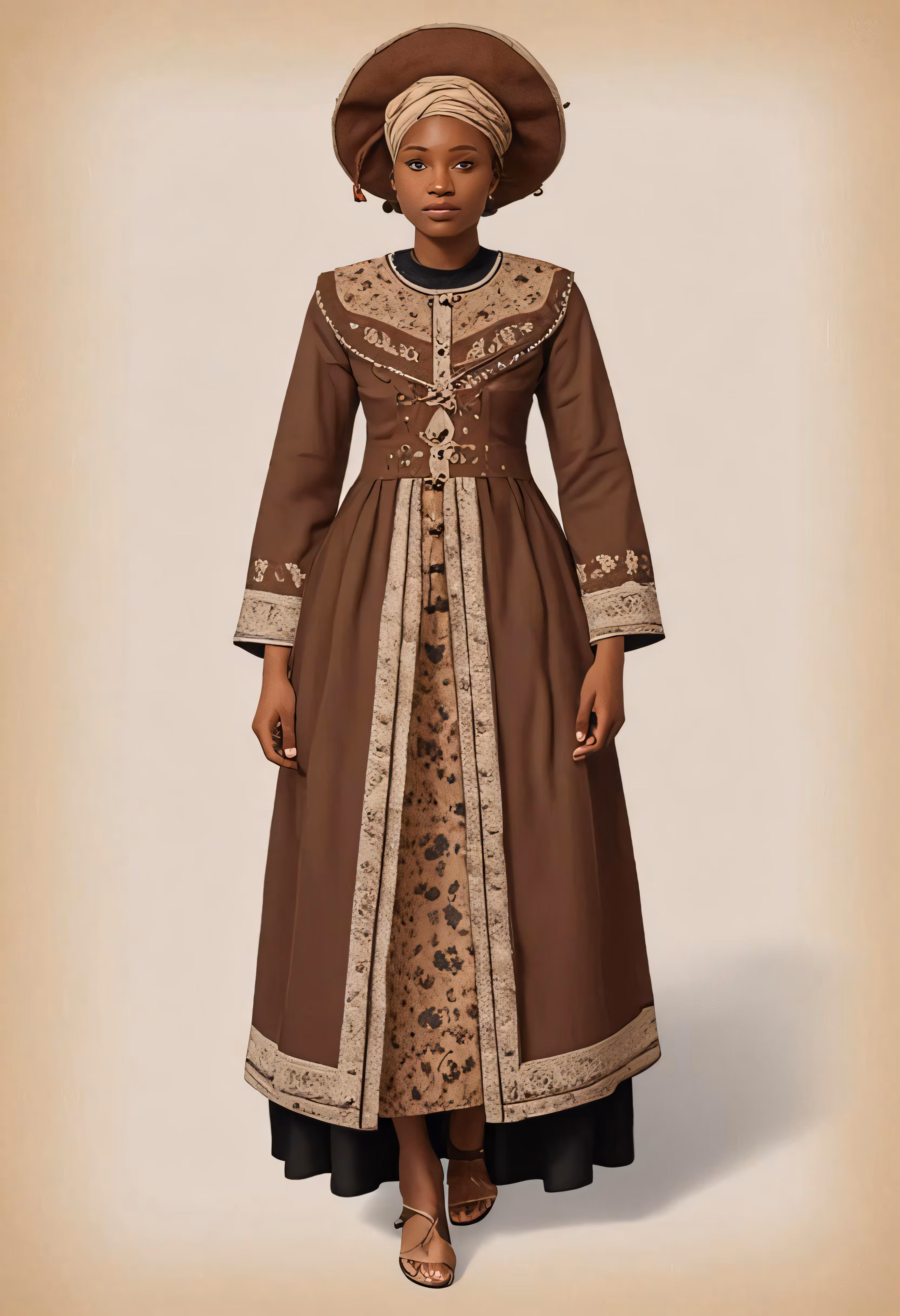 High resolution picture, free to use, the image of a woman in a brown and gold dress