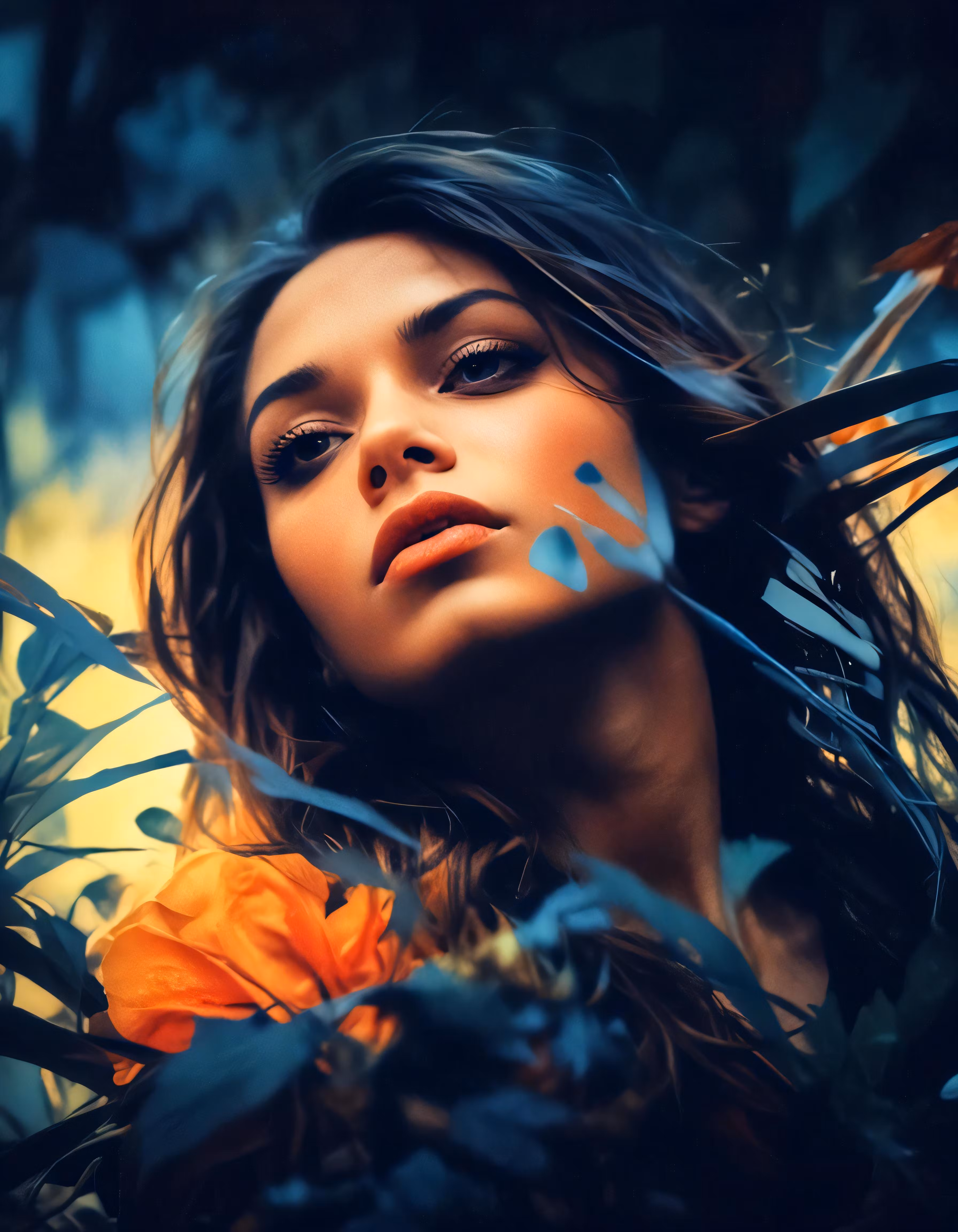 High resolution picture, free to use, the lady with leaves in her hands is staring