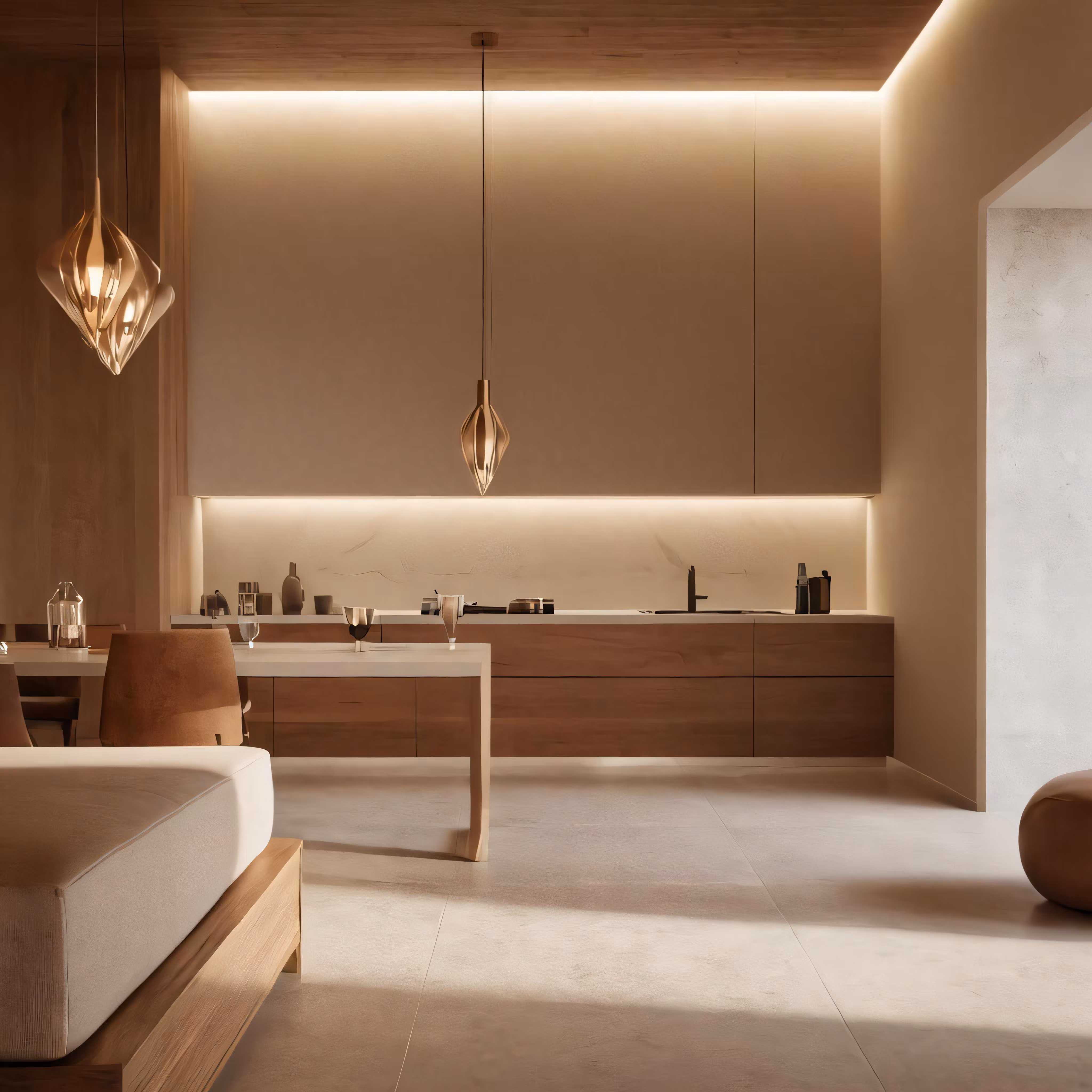 High resolution picture, free to use, the large, modern kitchen is surrounded by glass walls