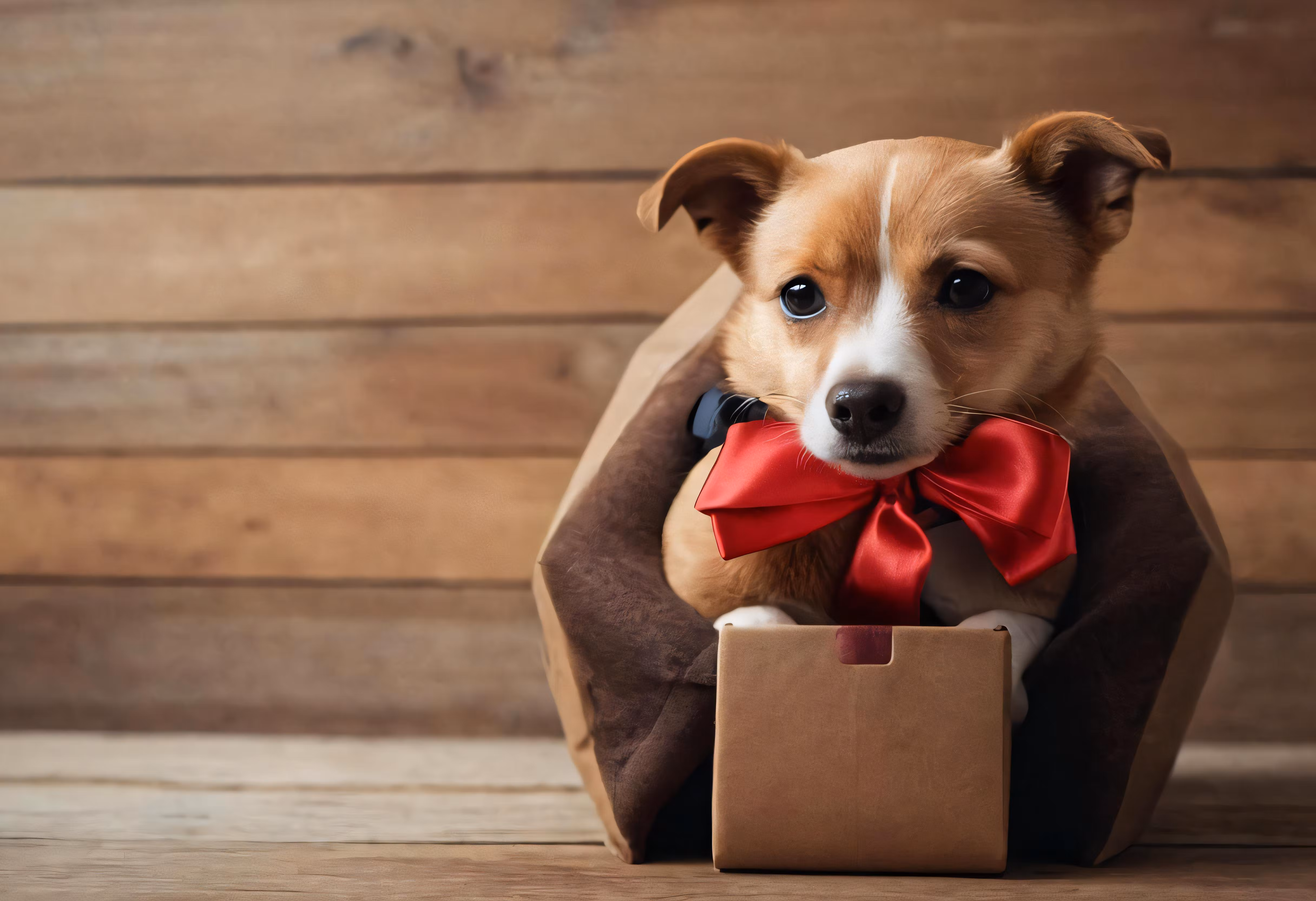 High resolution picture, free to use, the little dog has been stuffed in to a paper bag