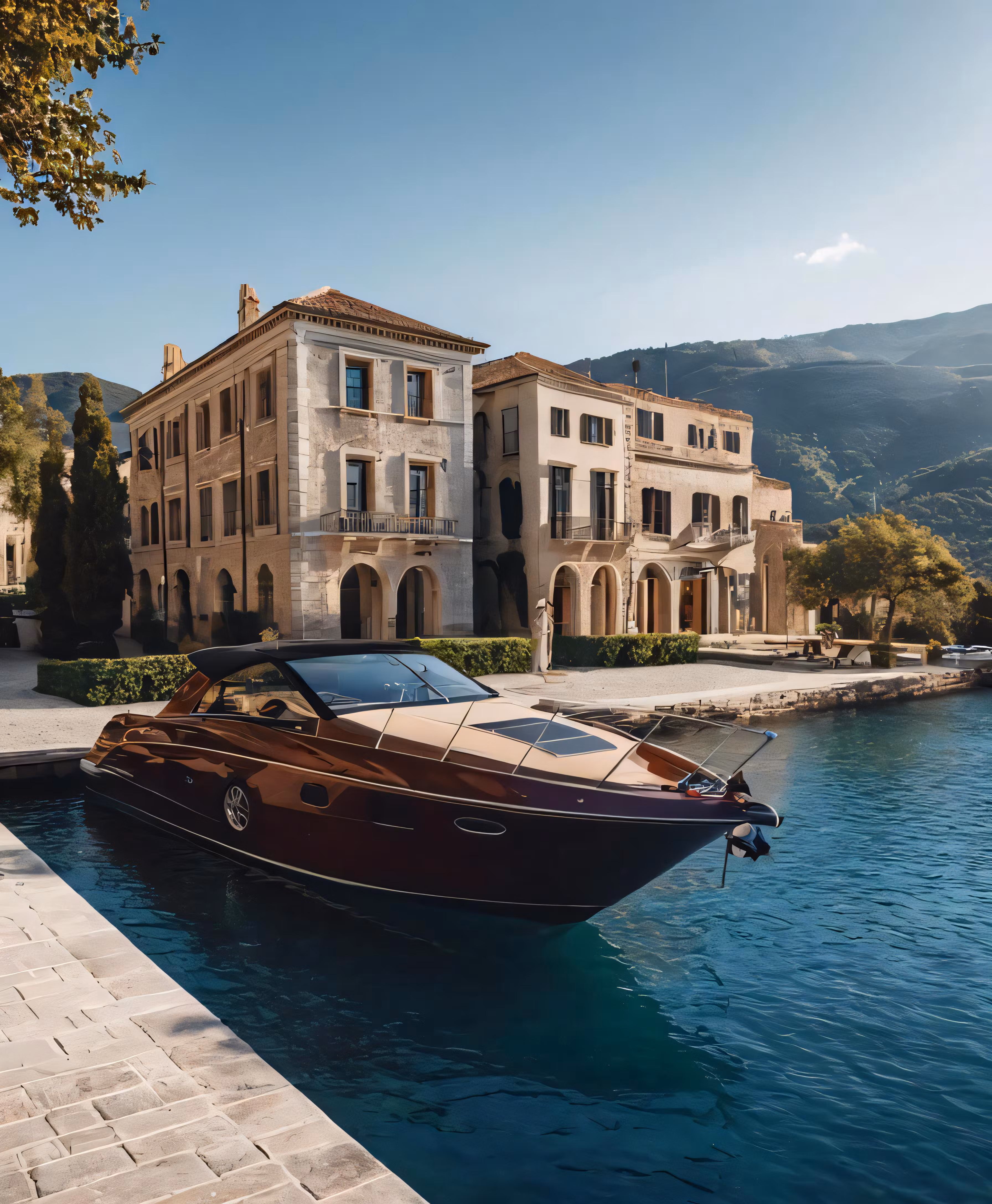 High resolution picture, free to use, the luxury boat is sitting on the water in front of the mansion