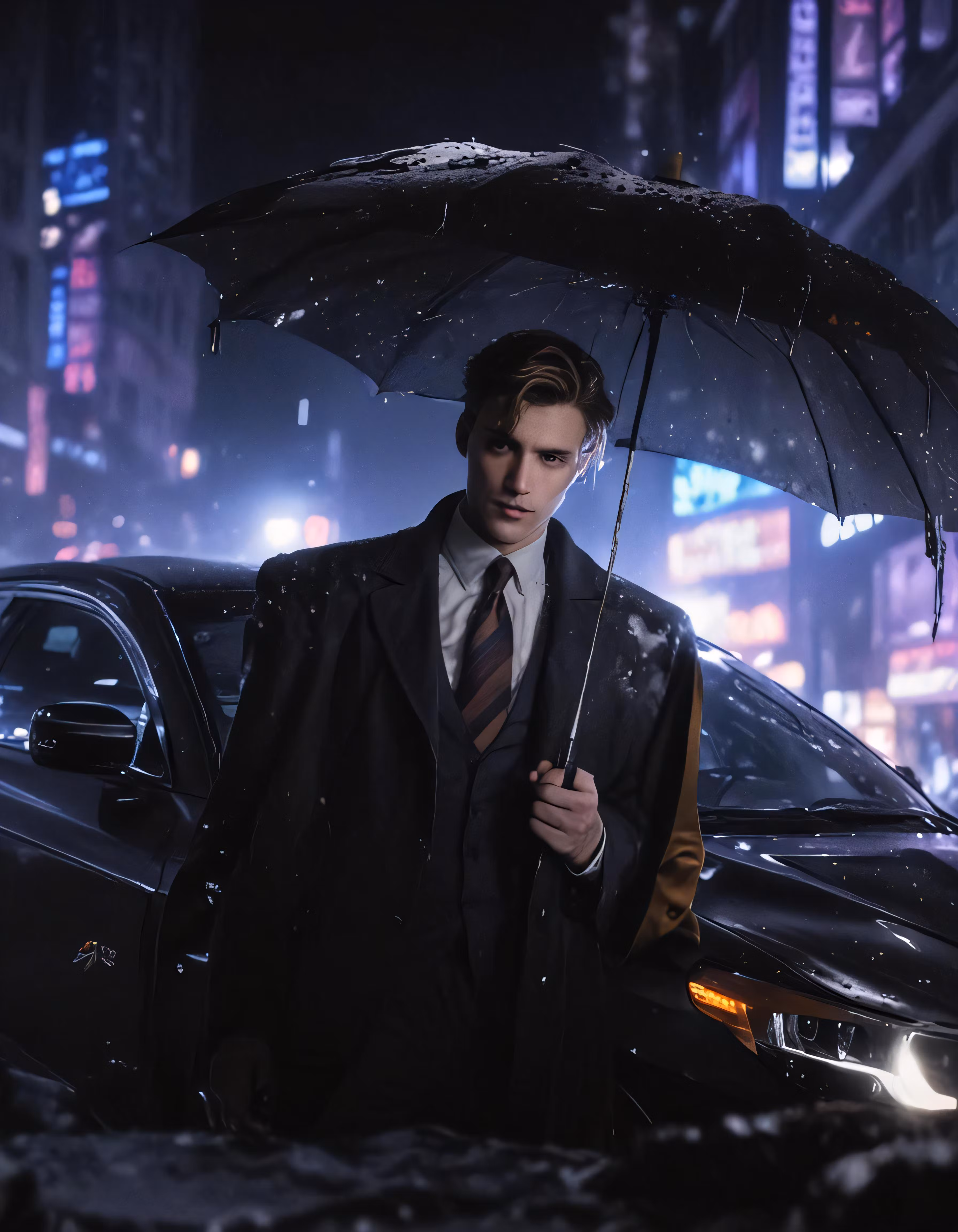 High resolution picture, free to use, the man in the suit is walking out on a rainy night