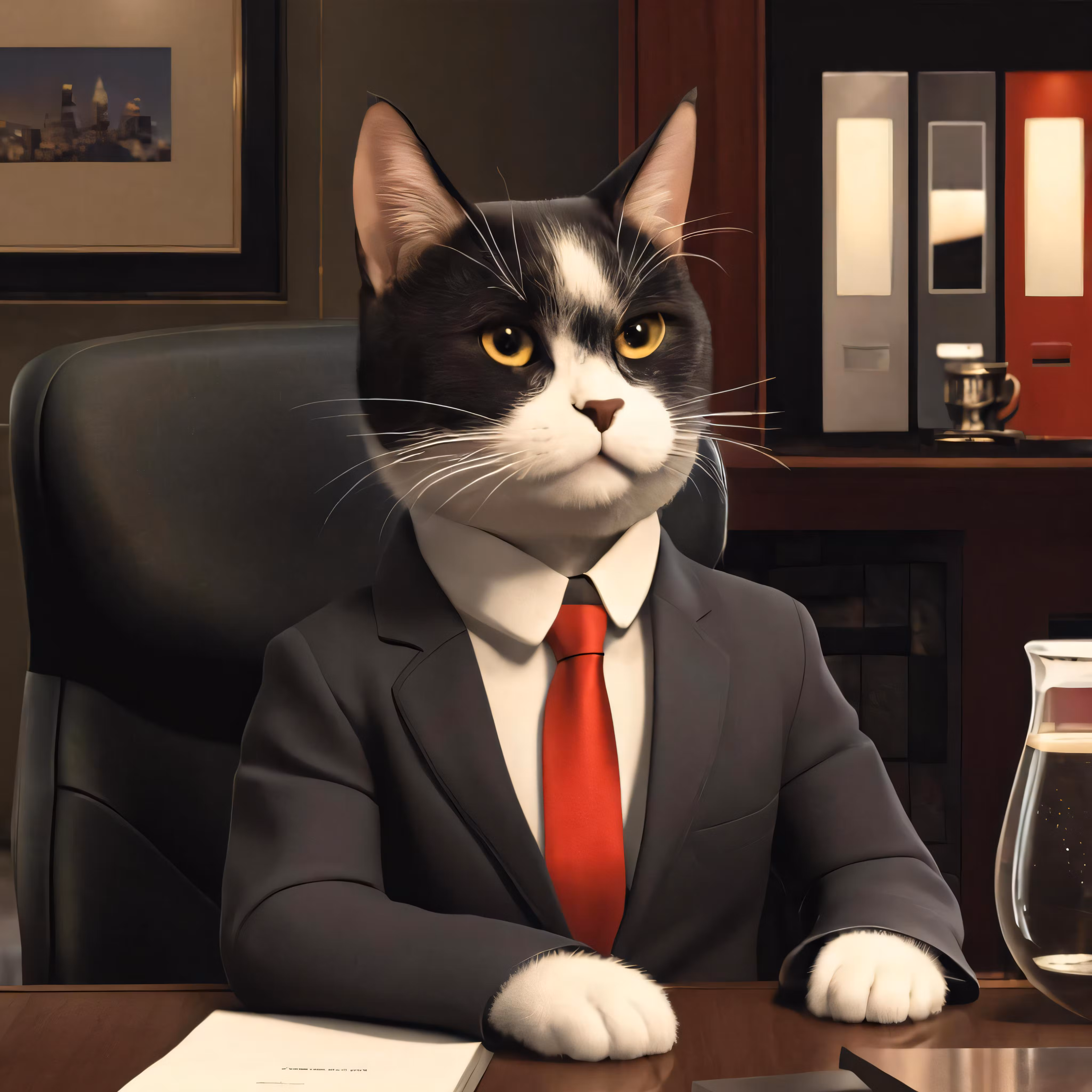 High resolution picture, free to use, the official logo for the 50 /a black and white cat in a suit sits at a desk