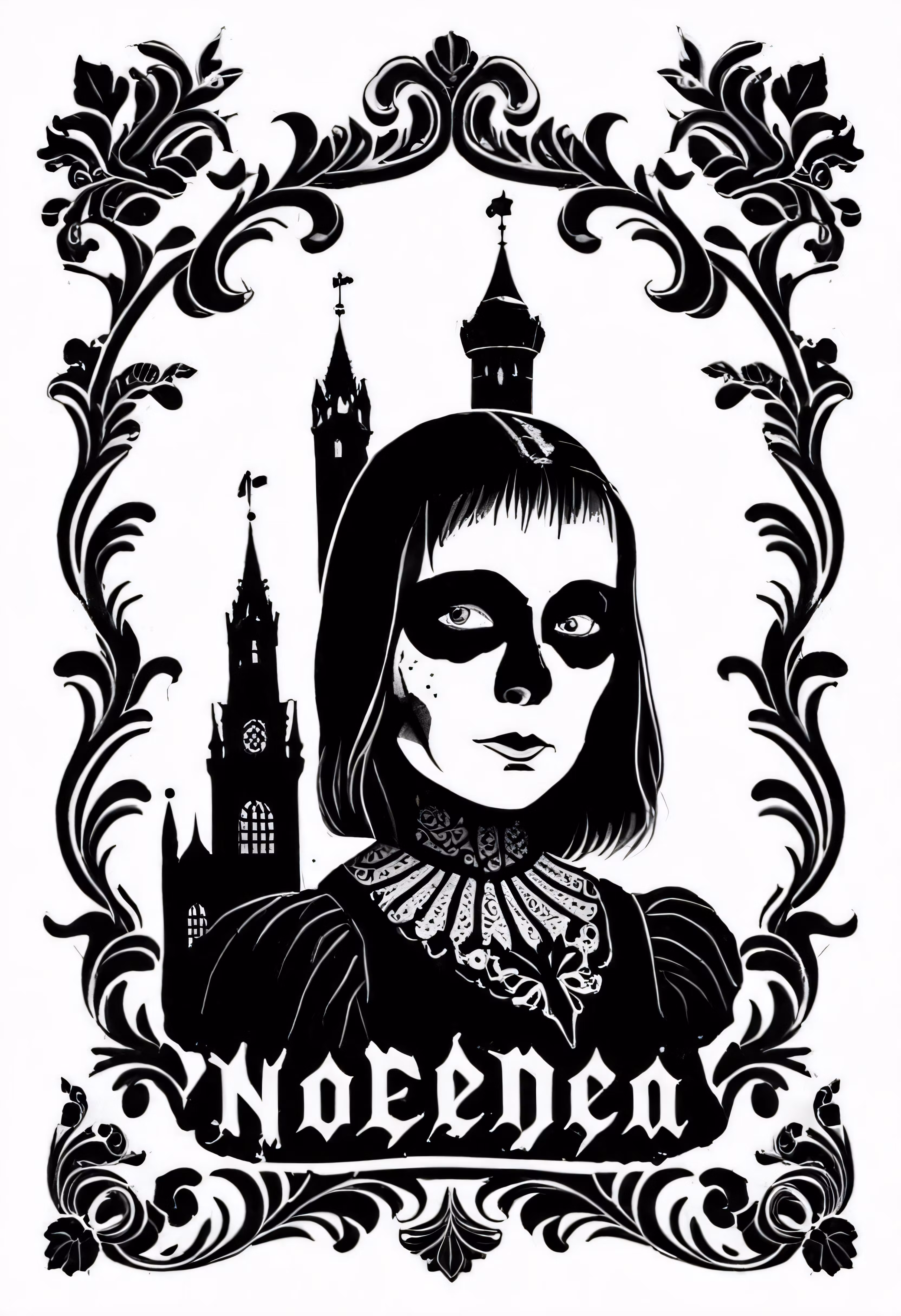 High resolution picture, free to use, the official logo for the 50 /a black and white drawing of a girl with an image of a castle