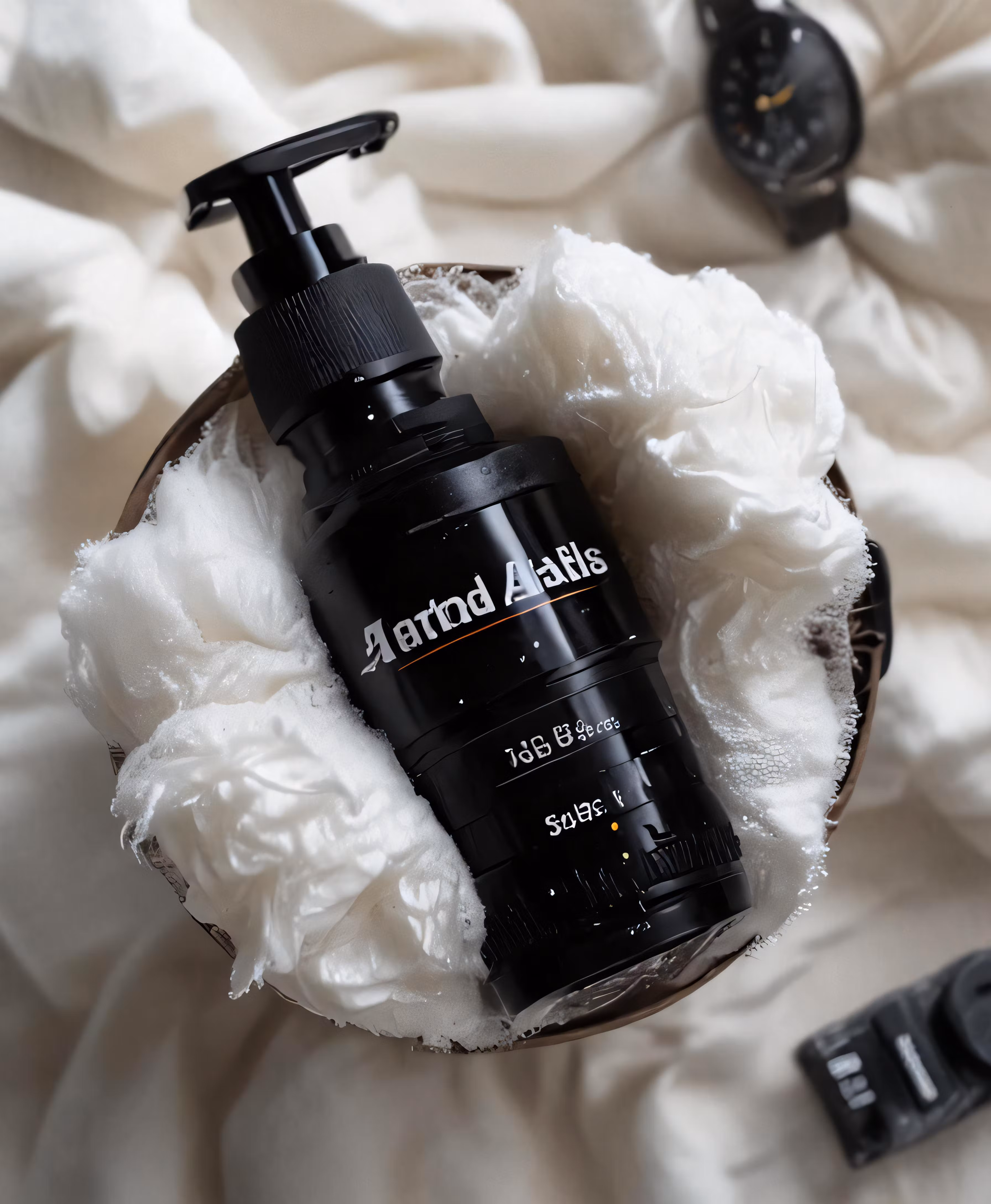 High resolution picture, free to use, the official logo for the 50 /a black bottle with white flecks sitting on top of a white blanket