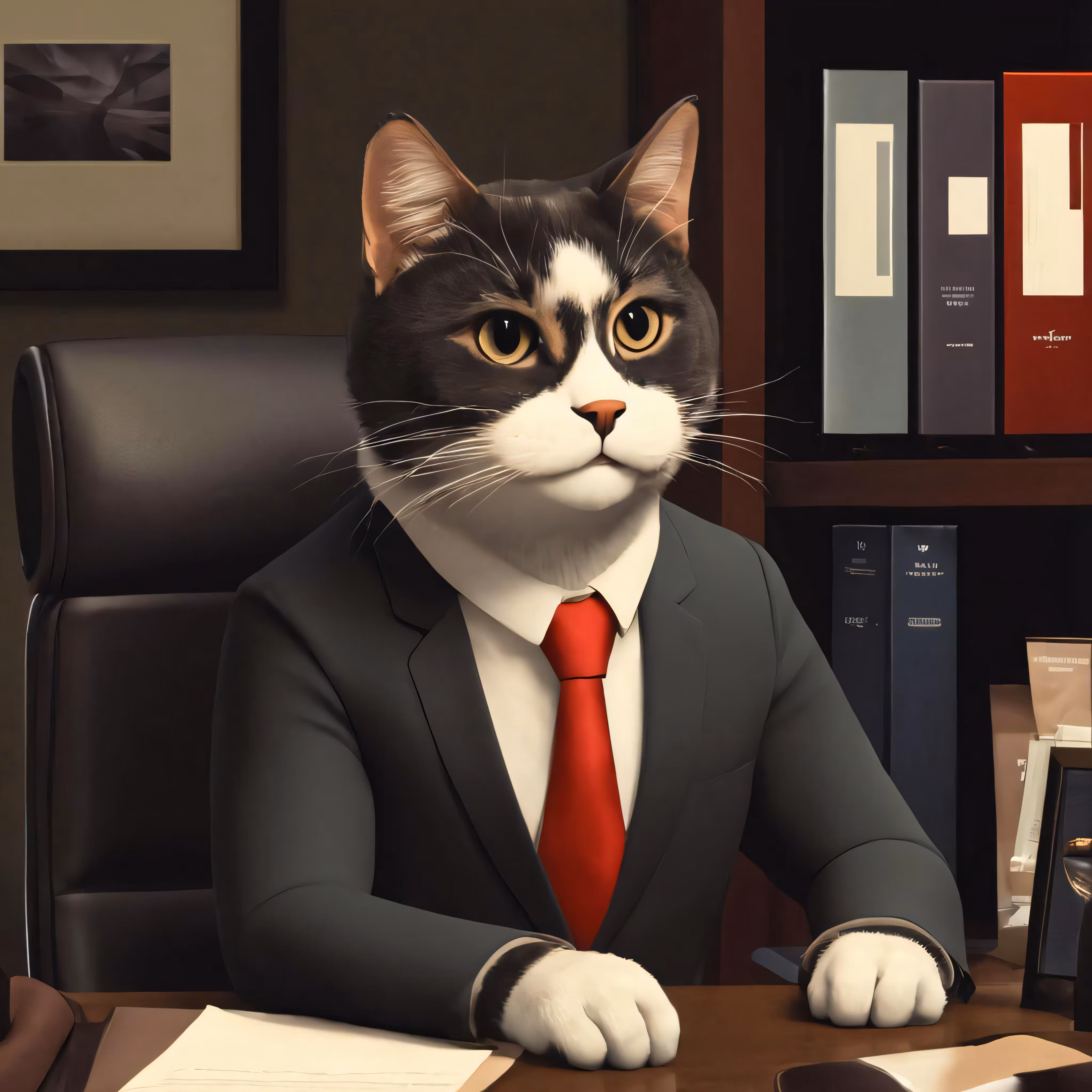 High resolution picture, free to use, the official logo for the 50 /a cat dressed as a man is sitting in front of a desk
