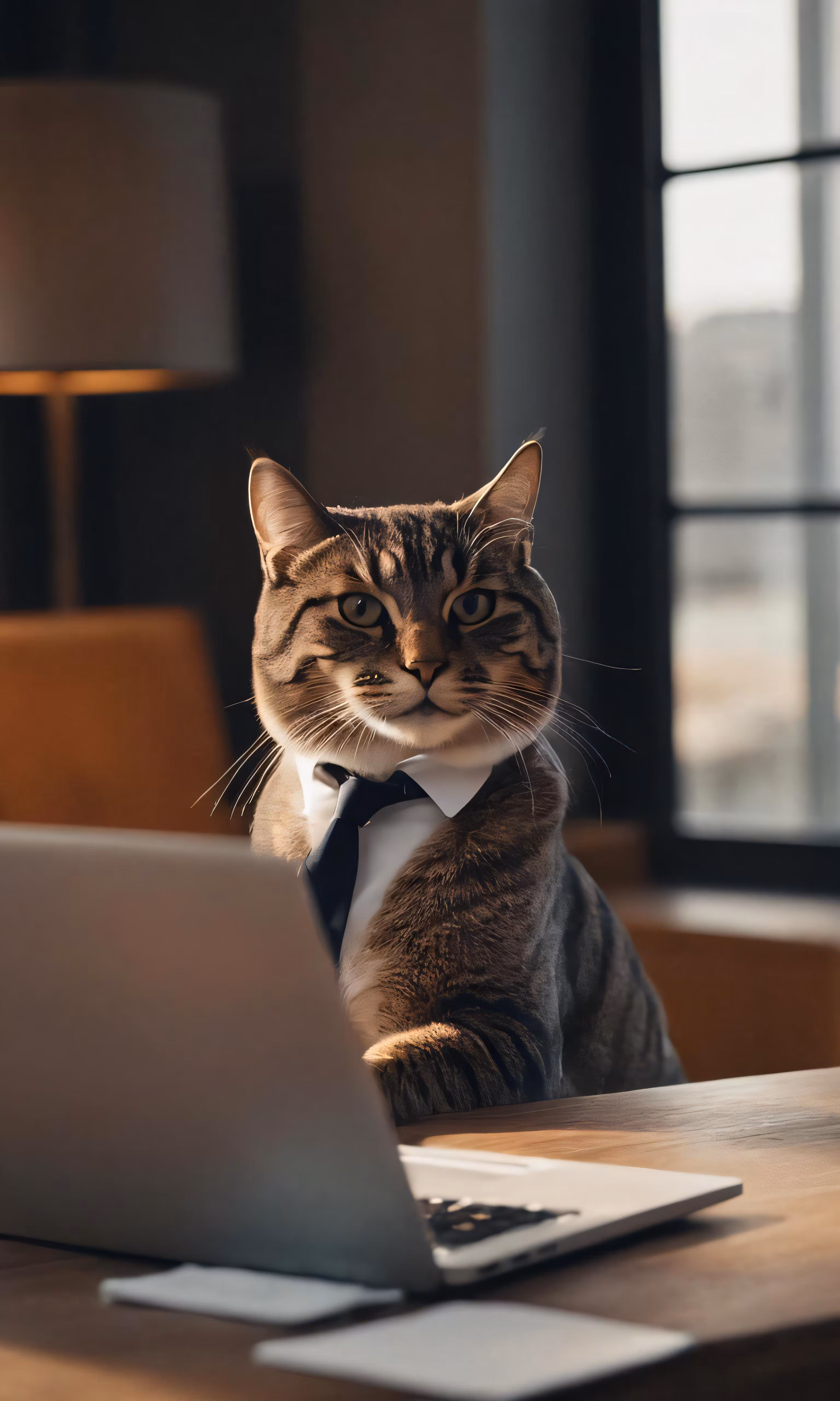 High resolution picture, free to use, the official logo for the 50 /a cat in a suit looks at the camera with a surprised look on its face