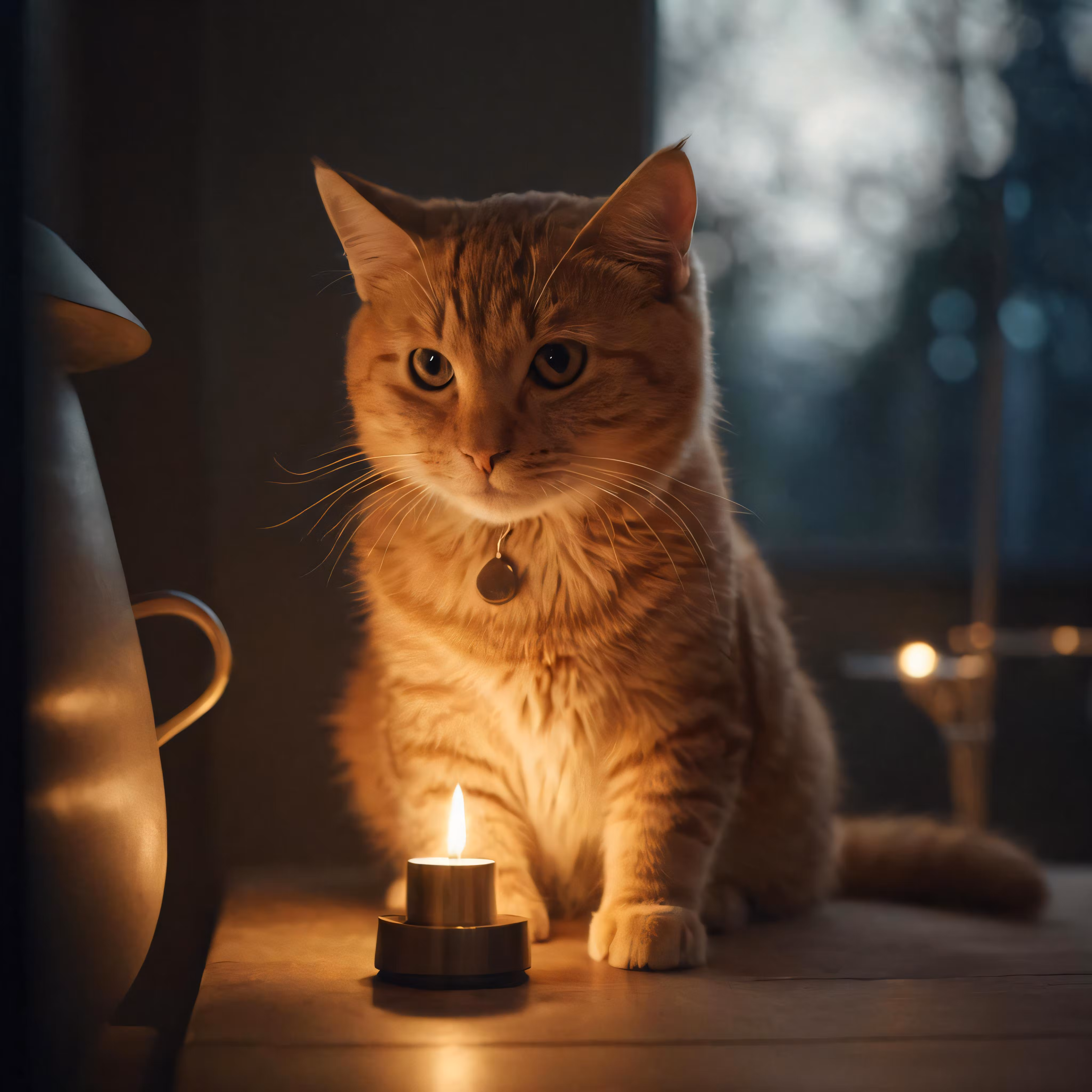 High resolution picture, free to use, the official logo for the 50 /a cat sits on a table with a lit candle in front of it