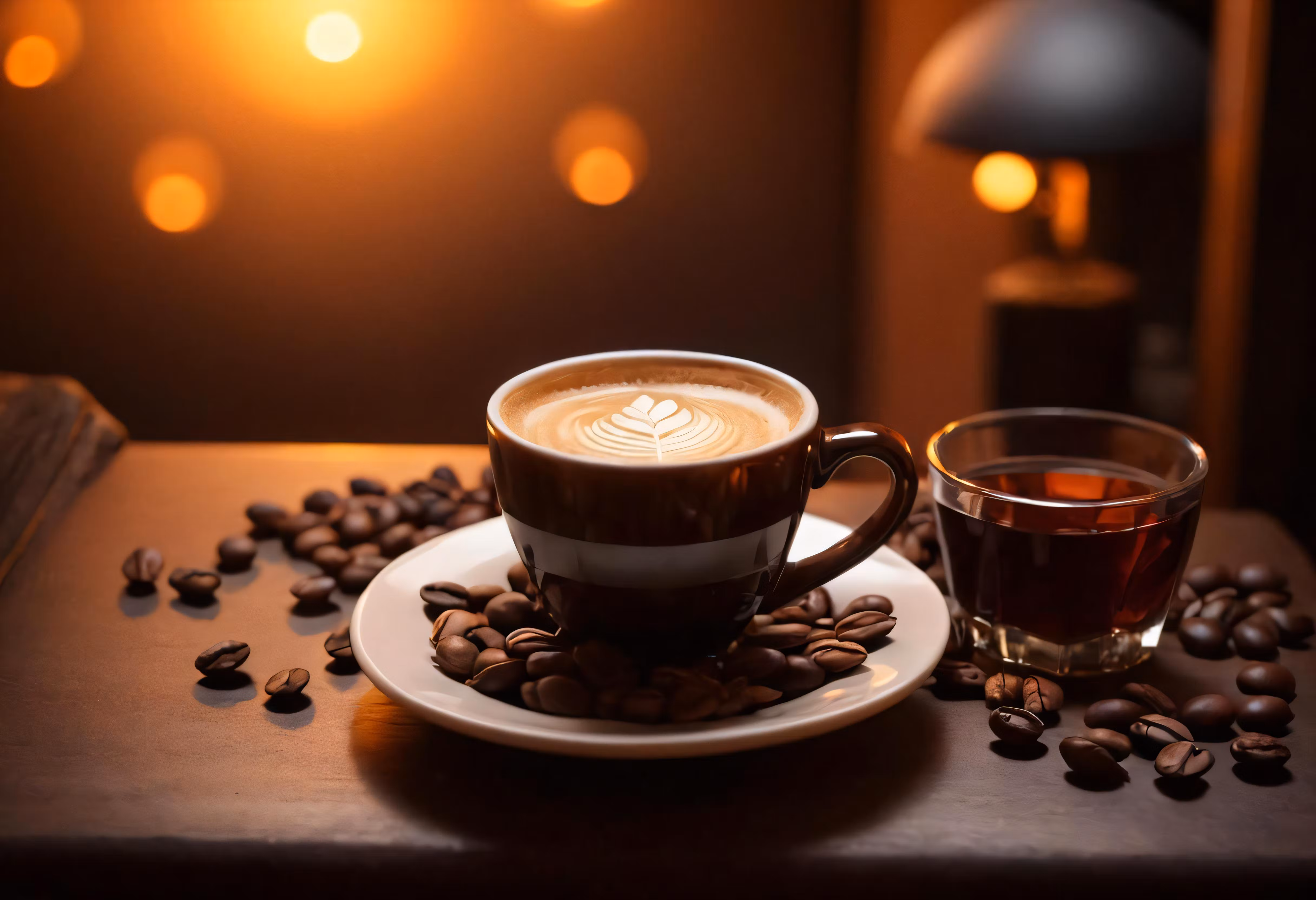 High resolution picture, free to use, the official logo for the 50 /a coffee cup on a saucer with a saucer and beans beside it
