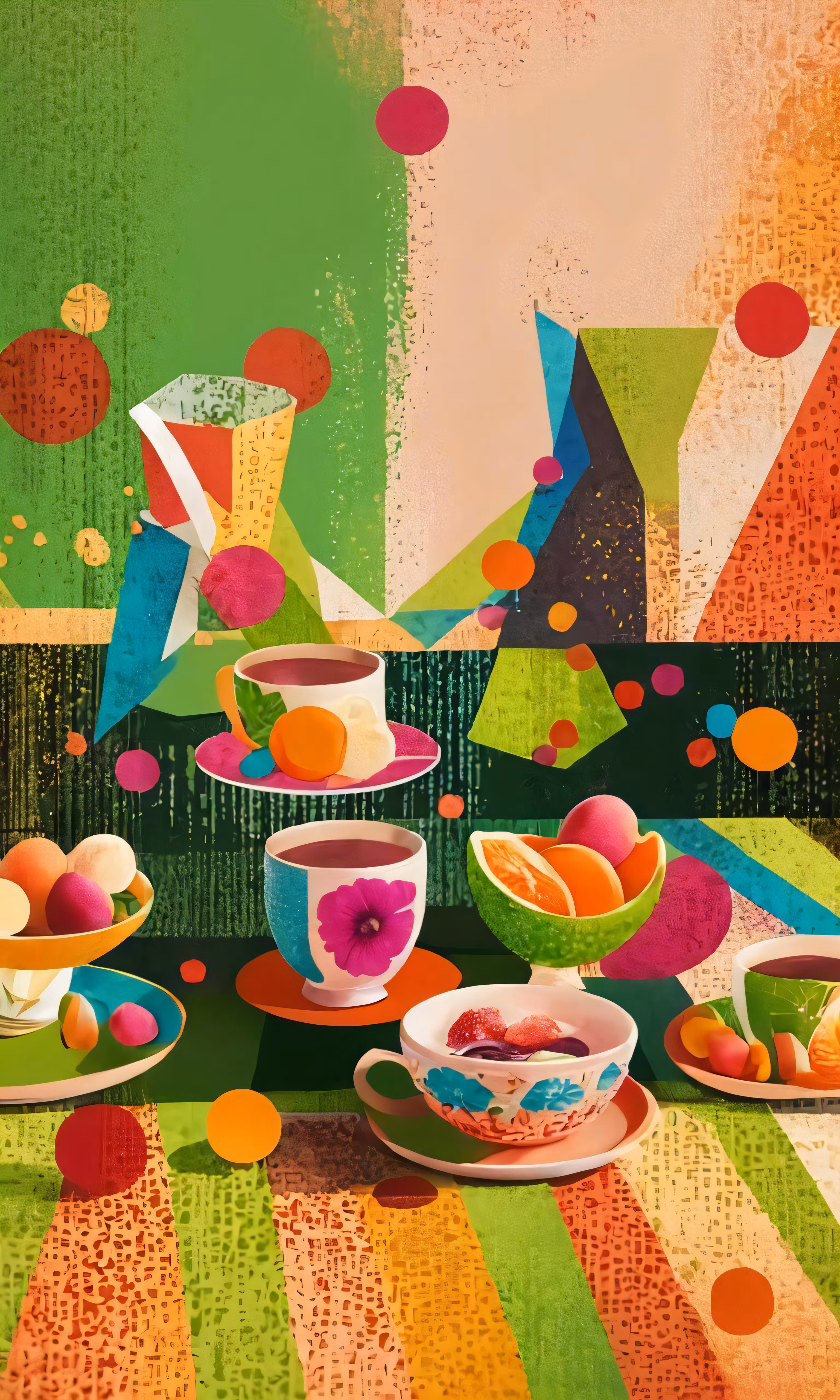 High resolution picture, free to use, the official logo for the 50 /a colorful abstract painting of a bowl filled with various food