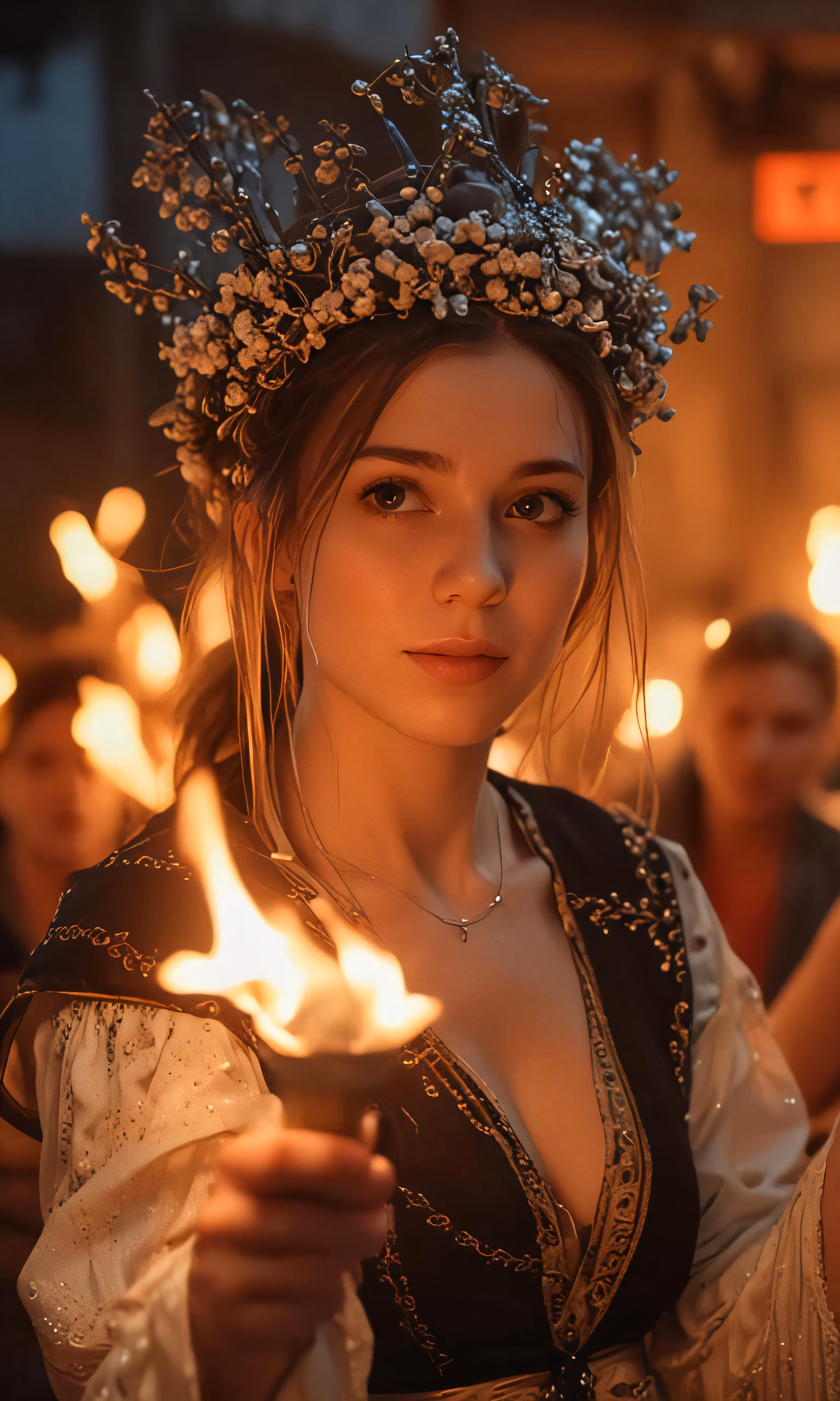 High resolution picture, free to use, the official logo for the 50 /a girl dressed in medieval garb holds a lit candle