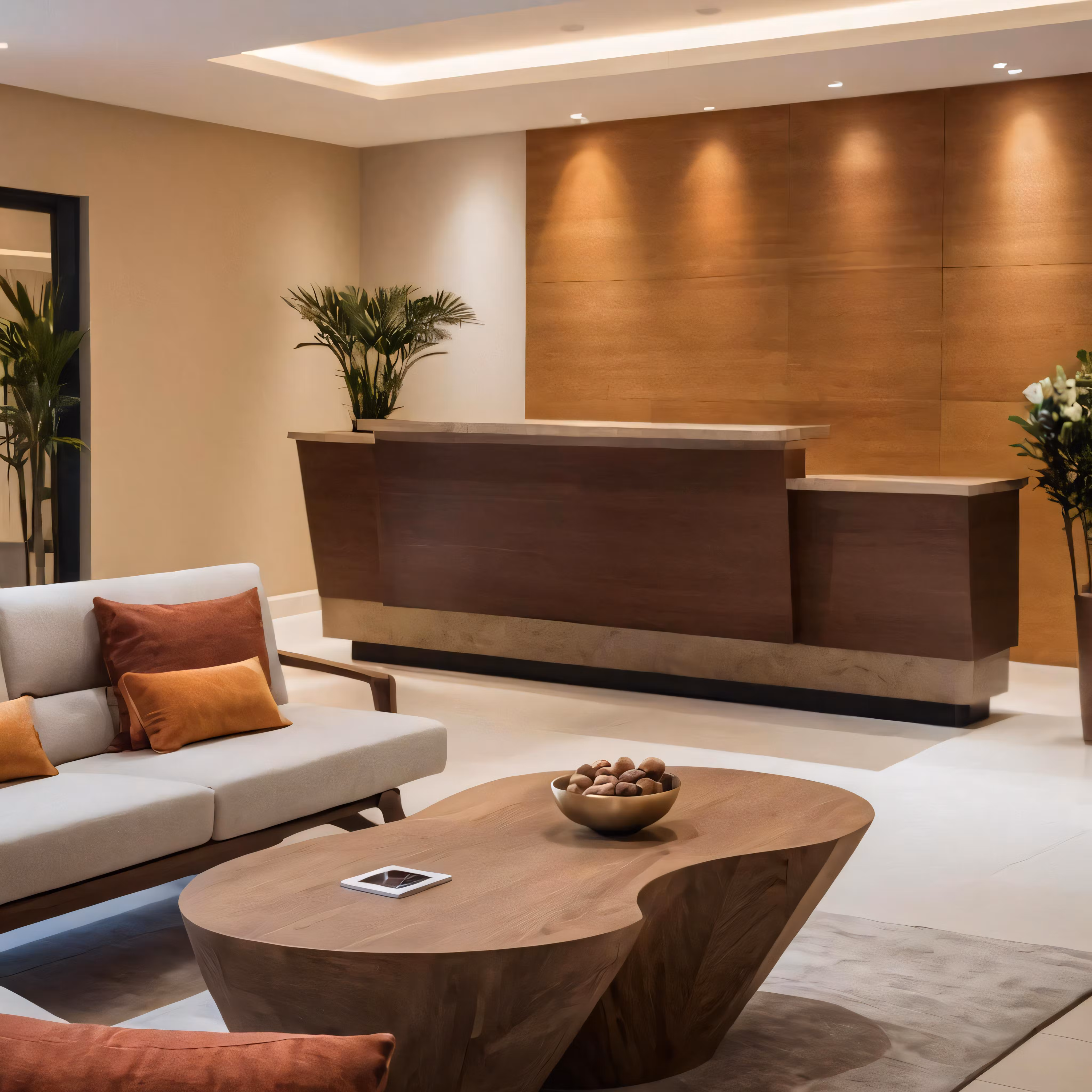 High resolution picture, free to use, the official logo for the 50 /a large wooden reception table surrounded by two sofas
