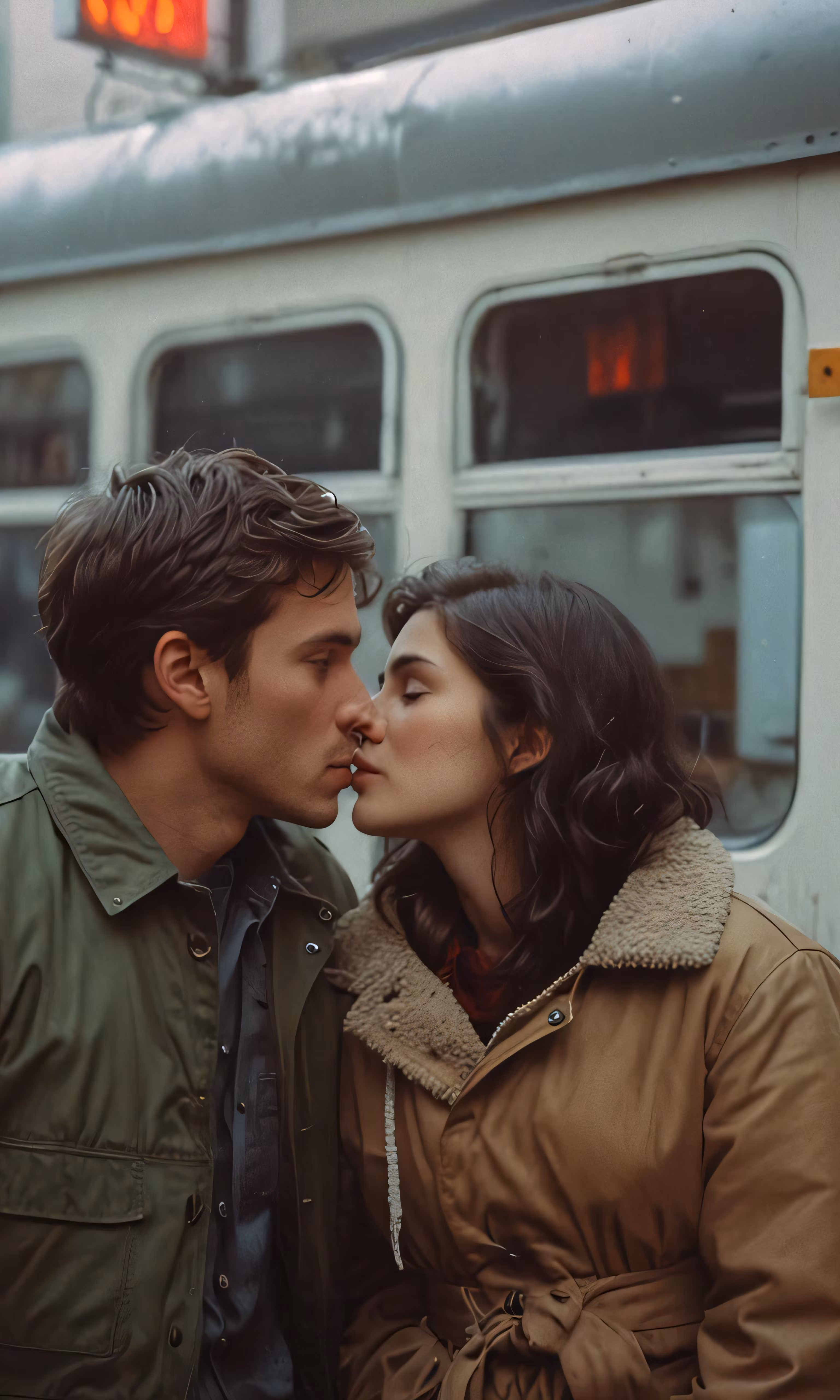 High resolution picture, free to use, the official logo for the 50 /a man and woman kissing while standing in front of a train