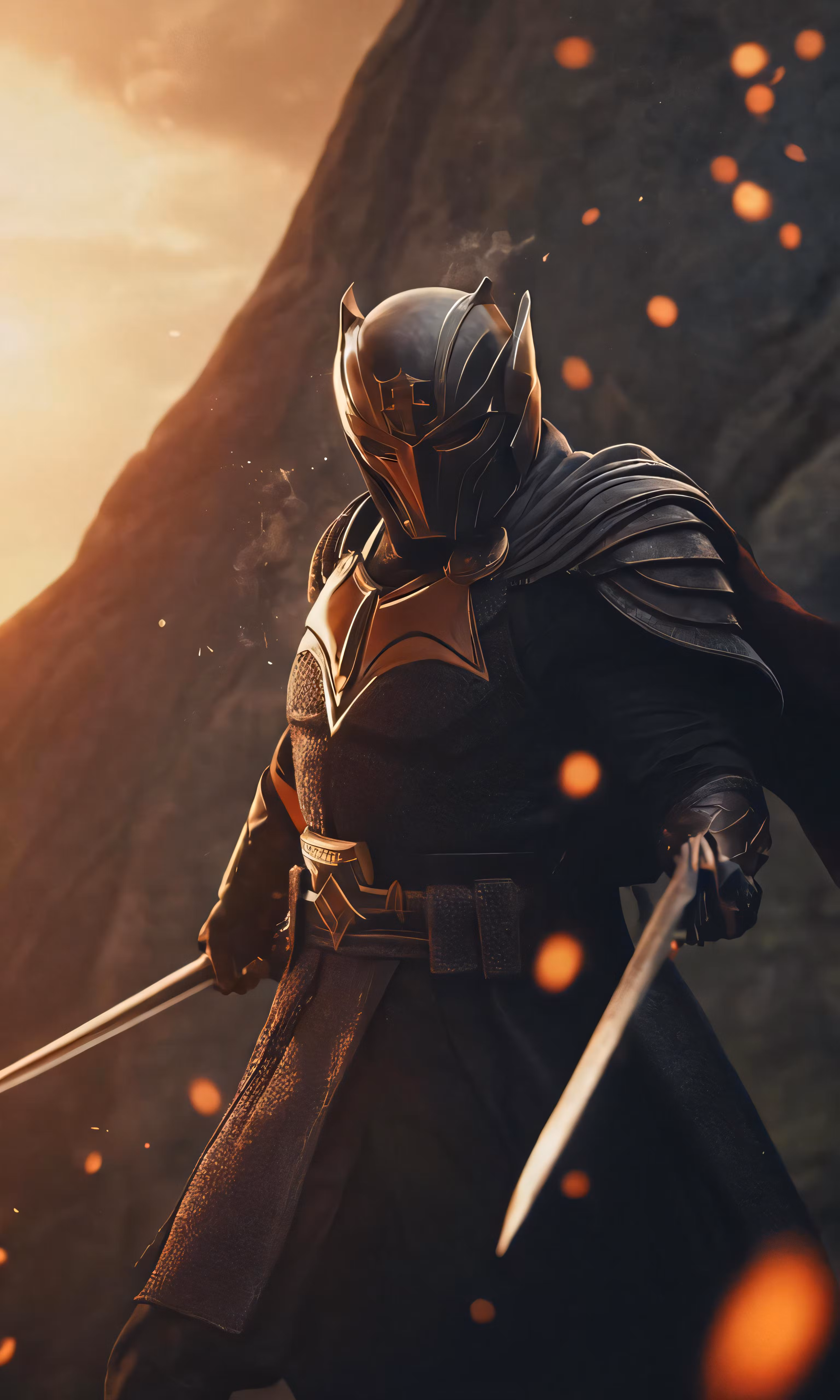 High resolution picture, free to use, the official logo for the 50 /a man in armor holding two sword near a mountain