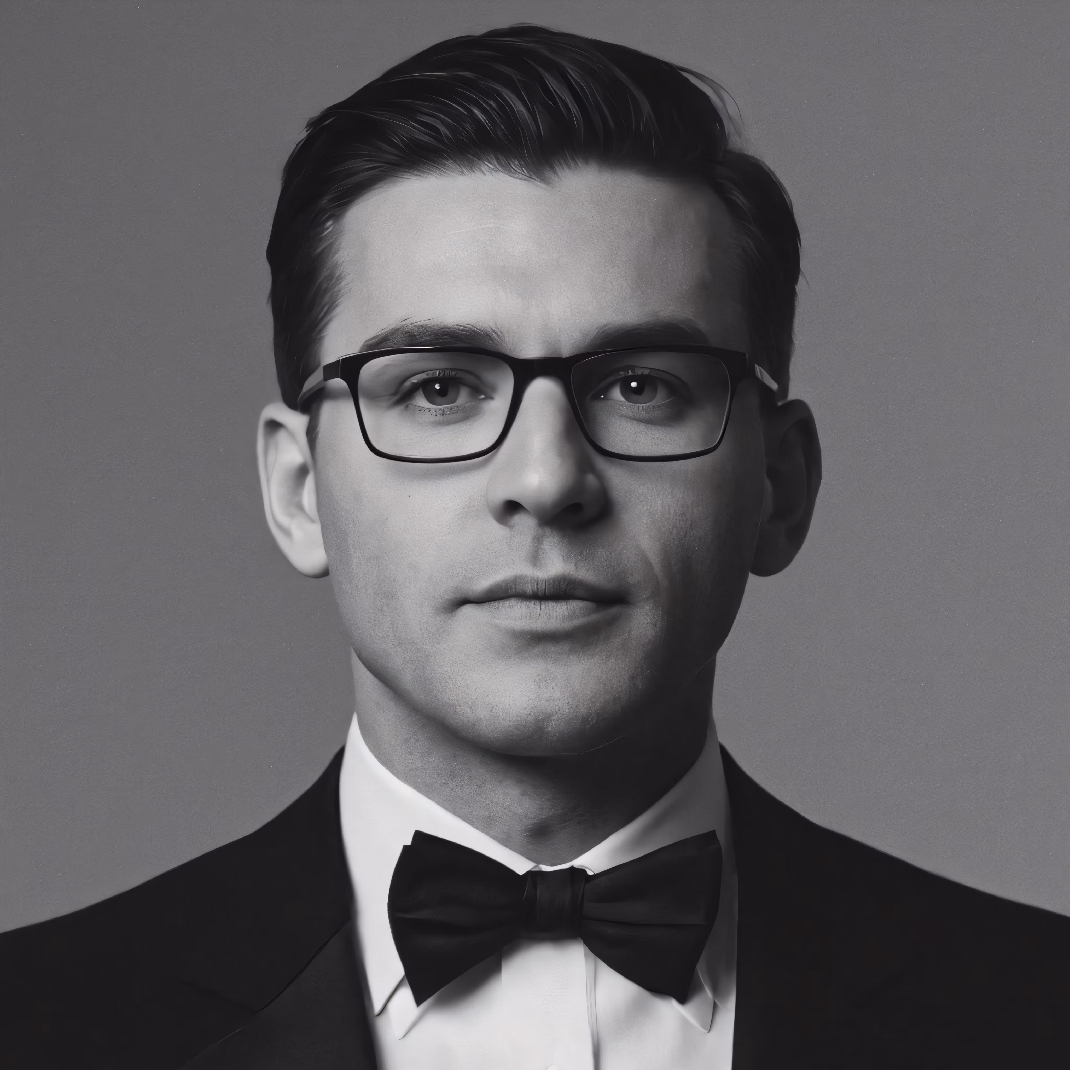 High resolution picture, free to use, the official logo for the 50 /a man in glasses and a tuxedo with a bow tie