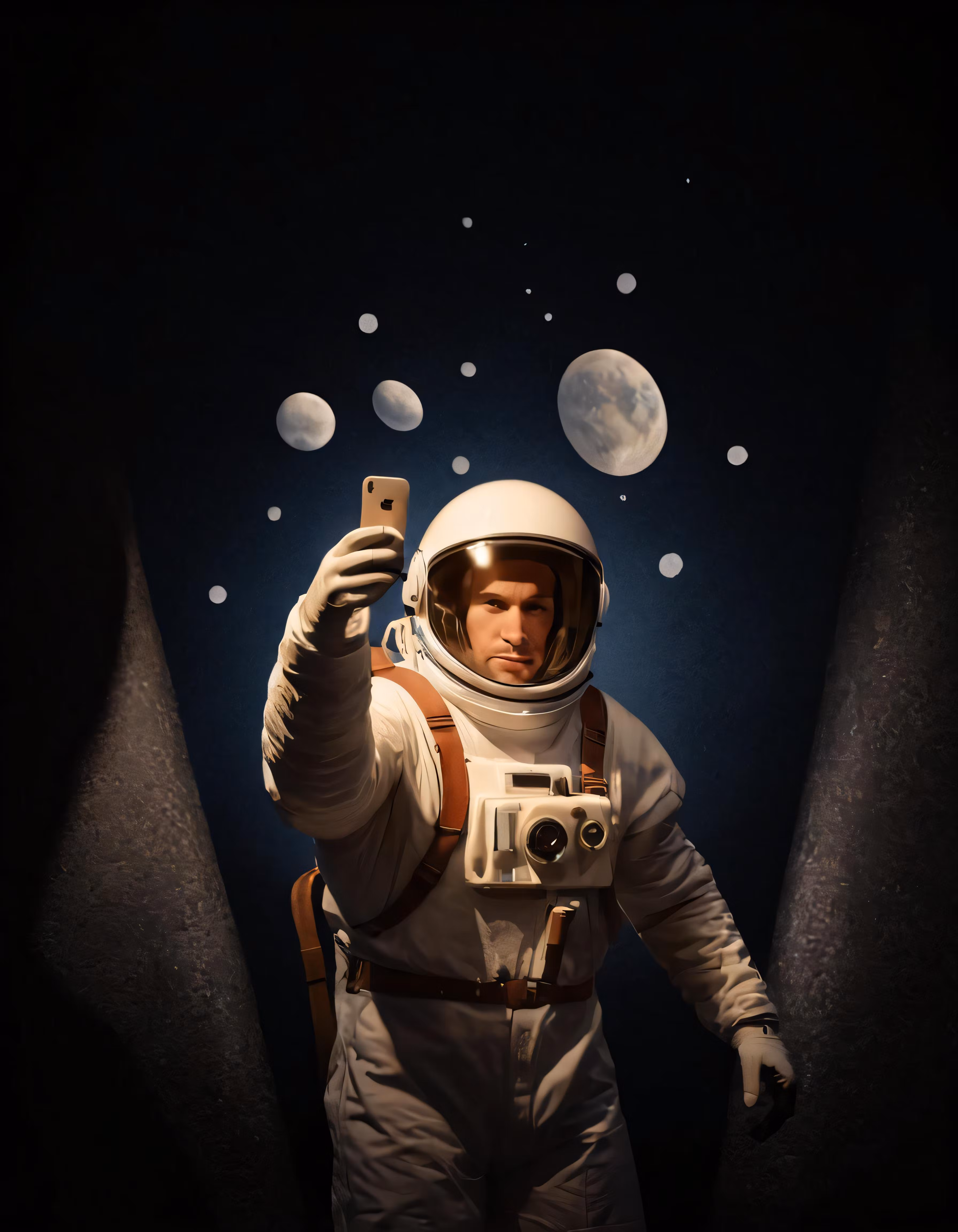 High resolution picture, free to use, the official logo for the 50 /a man in space suit standing with cellphone