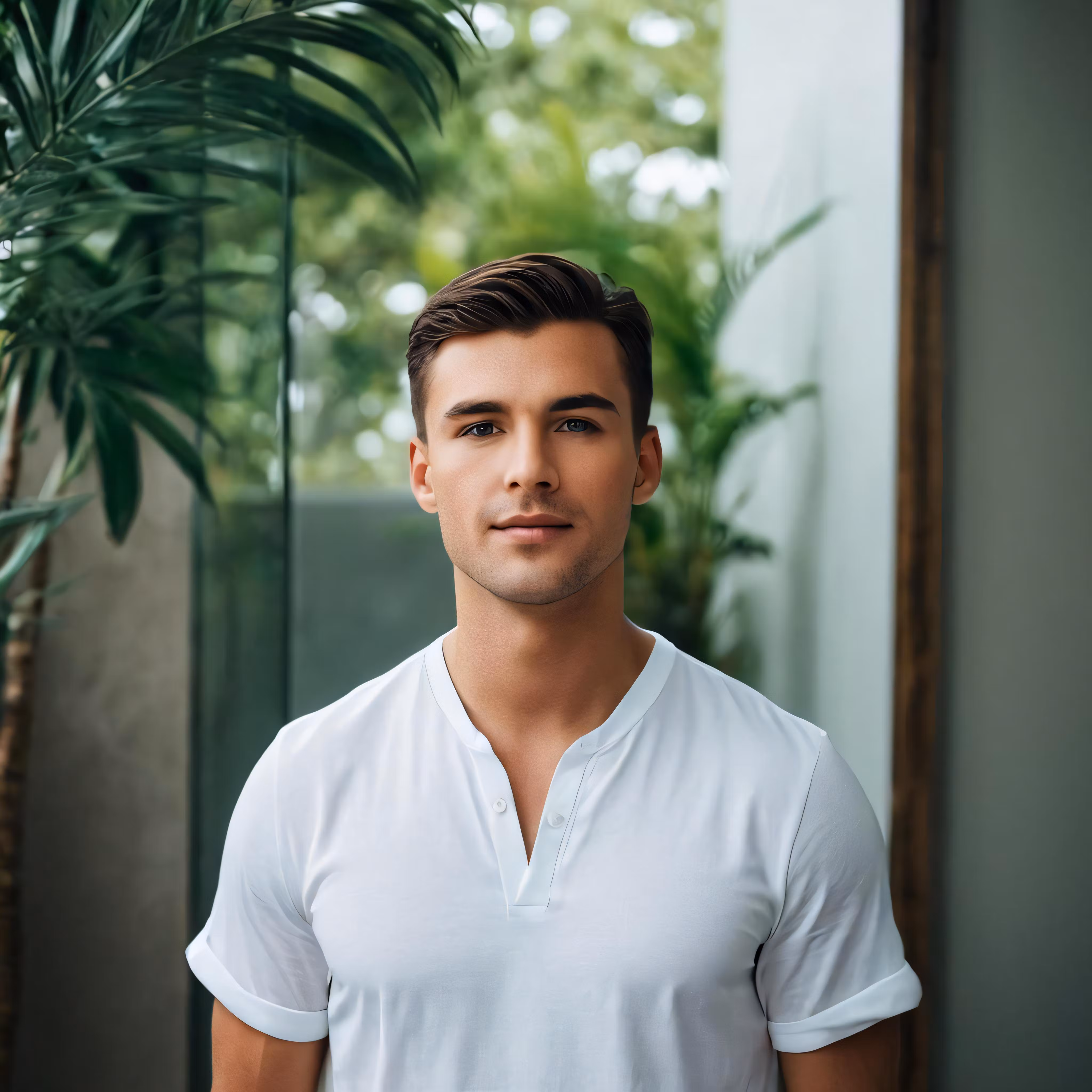 High resolution picture, free to use, the official logo for the 50 /a man in white shirt and white plant