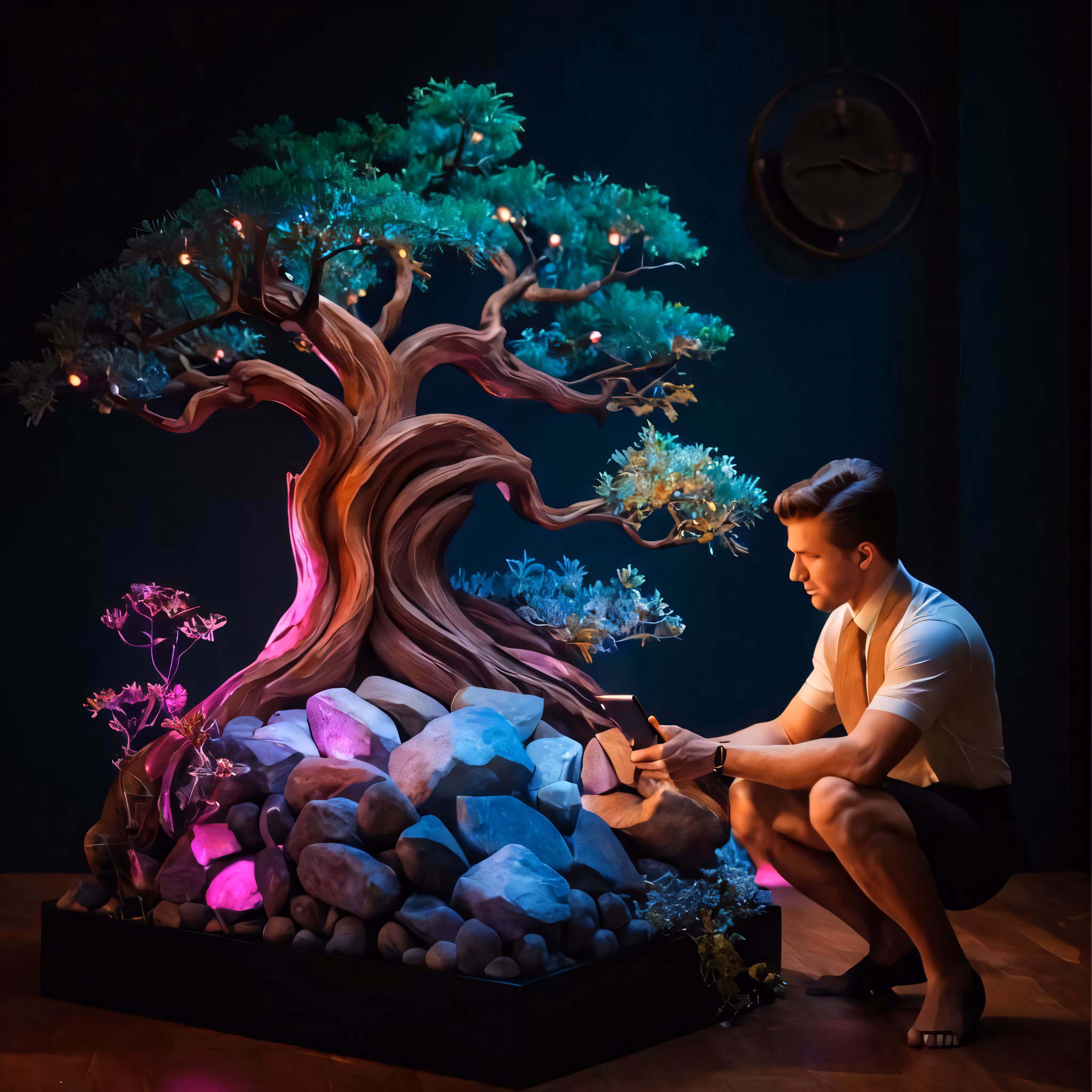 High resolution picture, free to use, the official logo for the 50 /a man kneeling down next to a tree with rocks around it