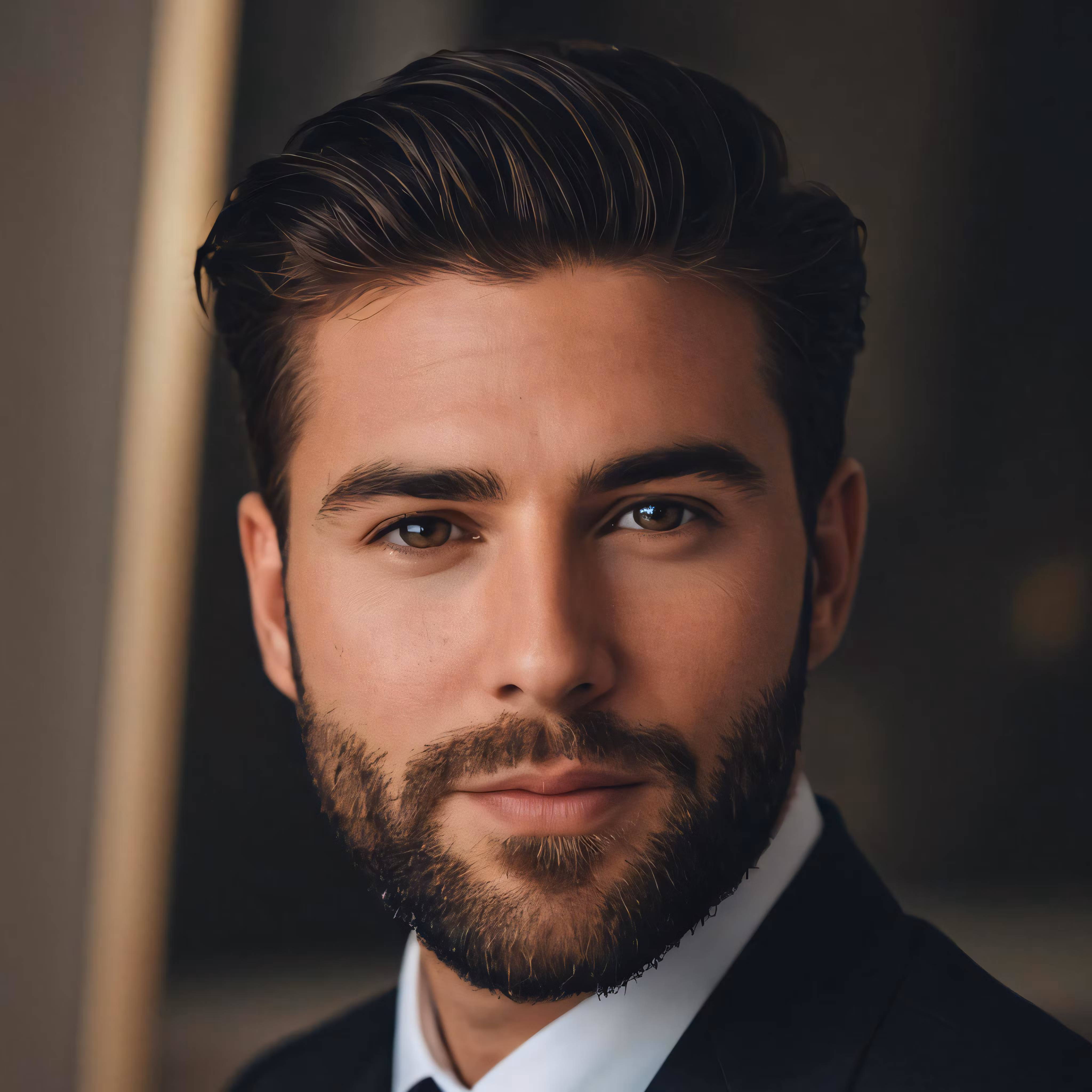 High resolution picture, free to use, the official logo for the 50 /a man with beard and wearing a suit