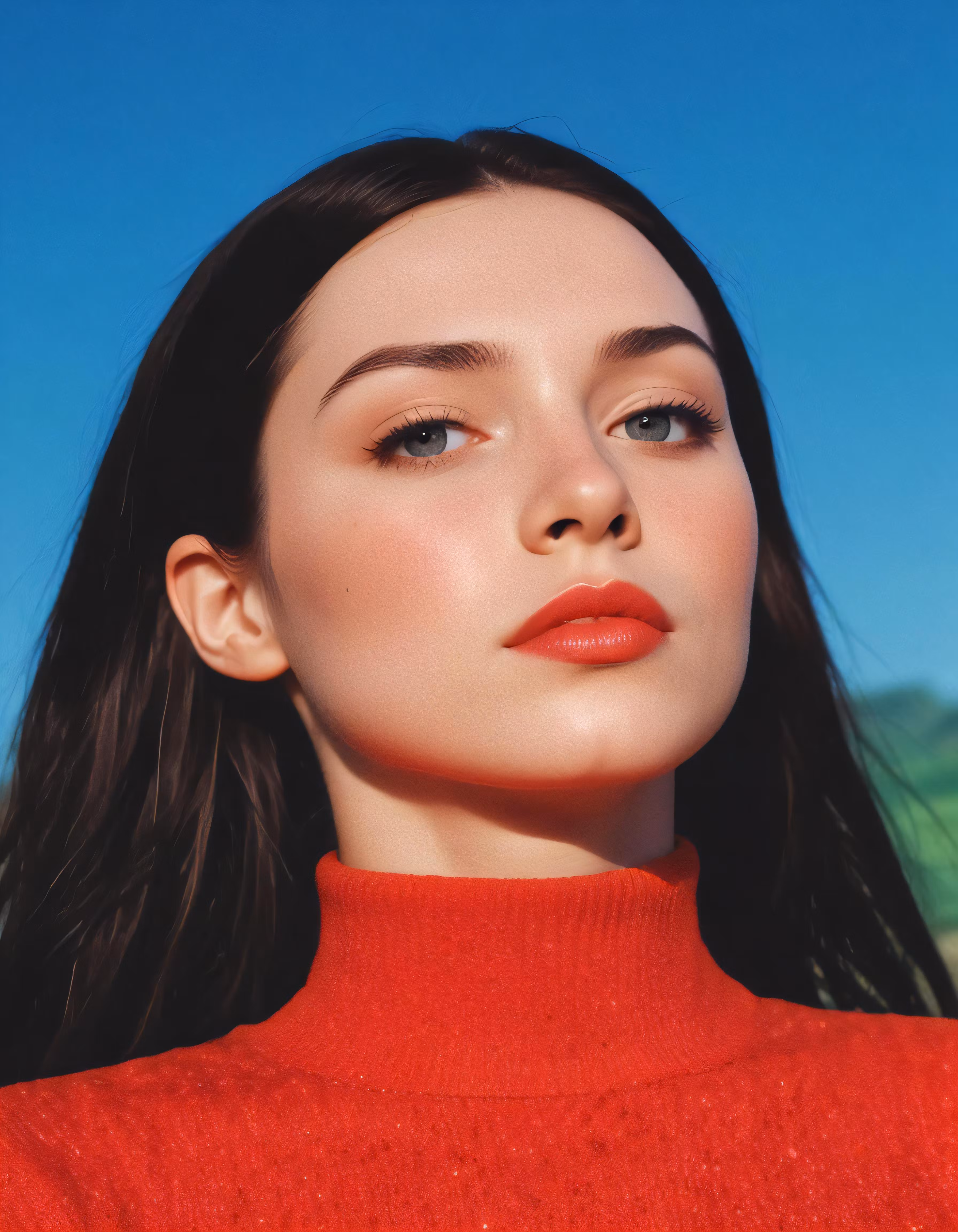 High resolution picture, free to use, the official logo for the 50 /a model with sleek, dark hair poses in an orange outfit against a bright blue sky