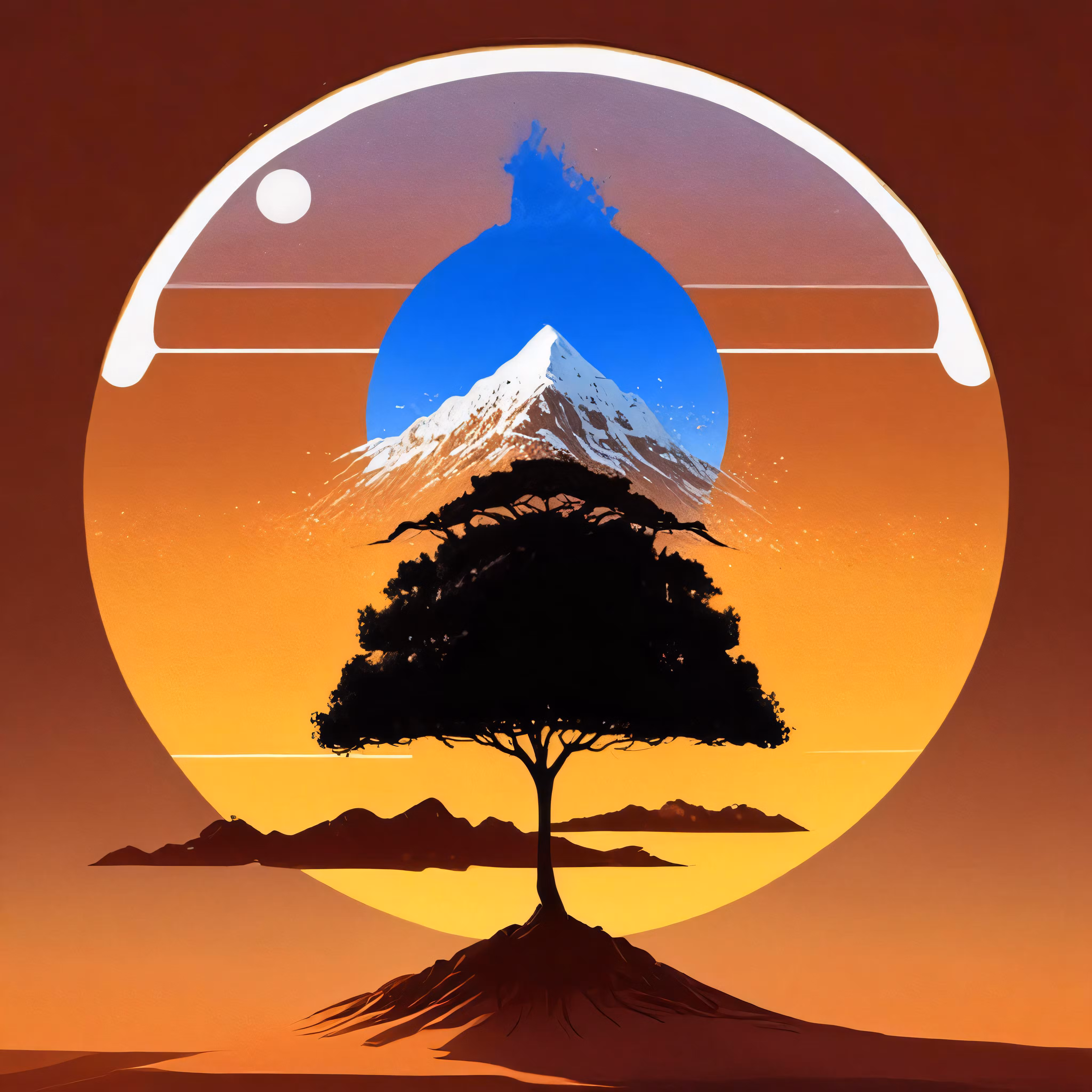 High resolution picture, free to use, the official logo for the 50 /a mountain, trees, and sky silhouetted by an orange and blue sunset