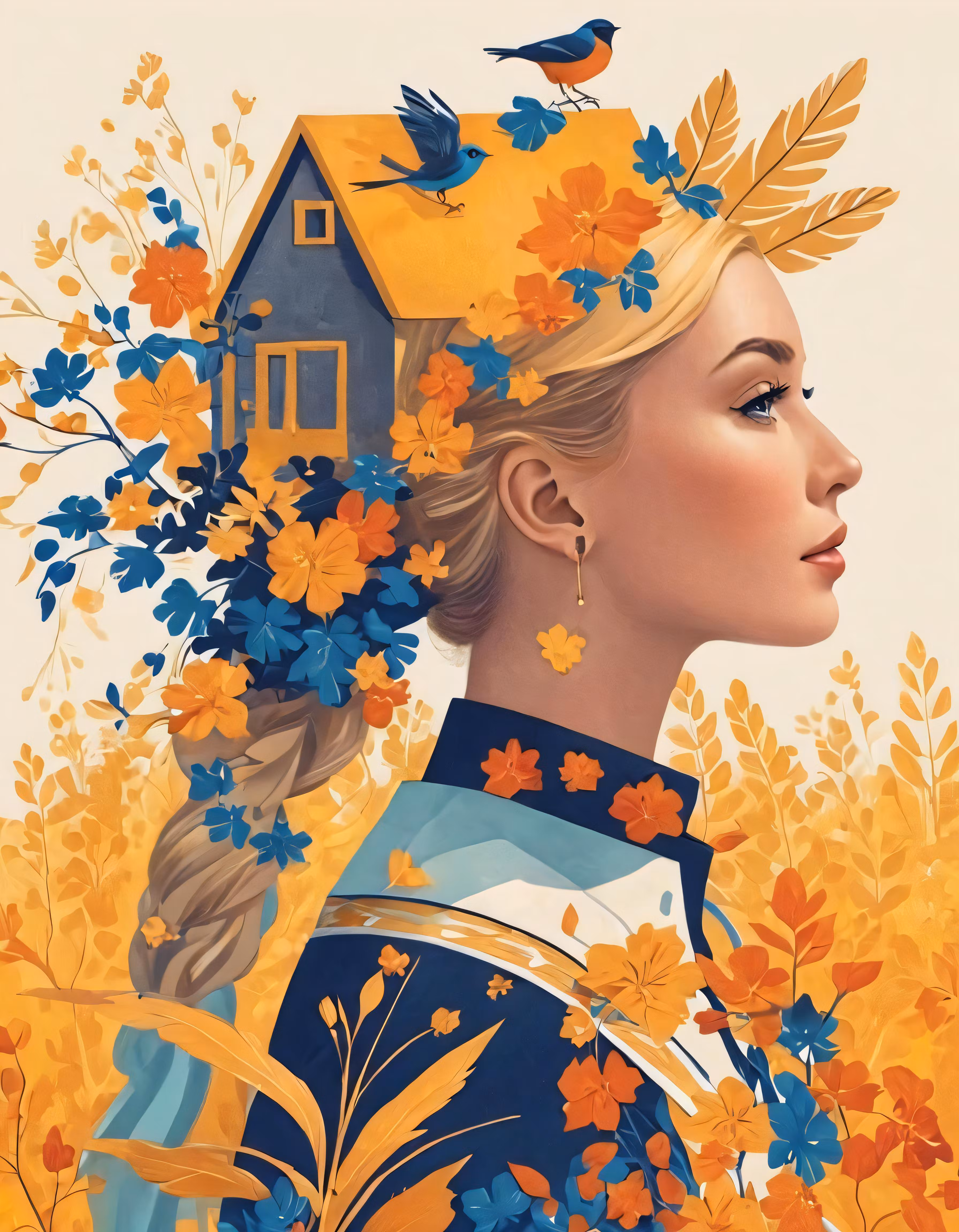 High resolution picture, free to use, the official logo for the 50 /a painting shows a woman with blonde hair and blue and yellow flowers