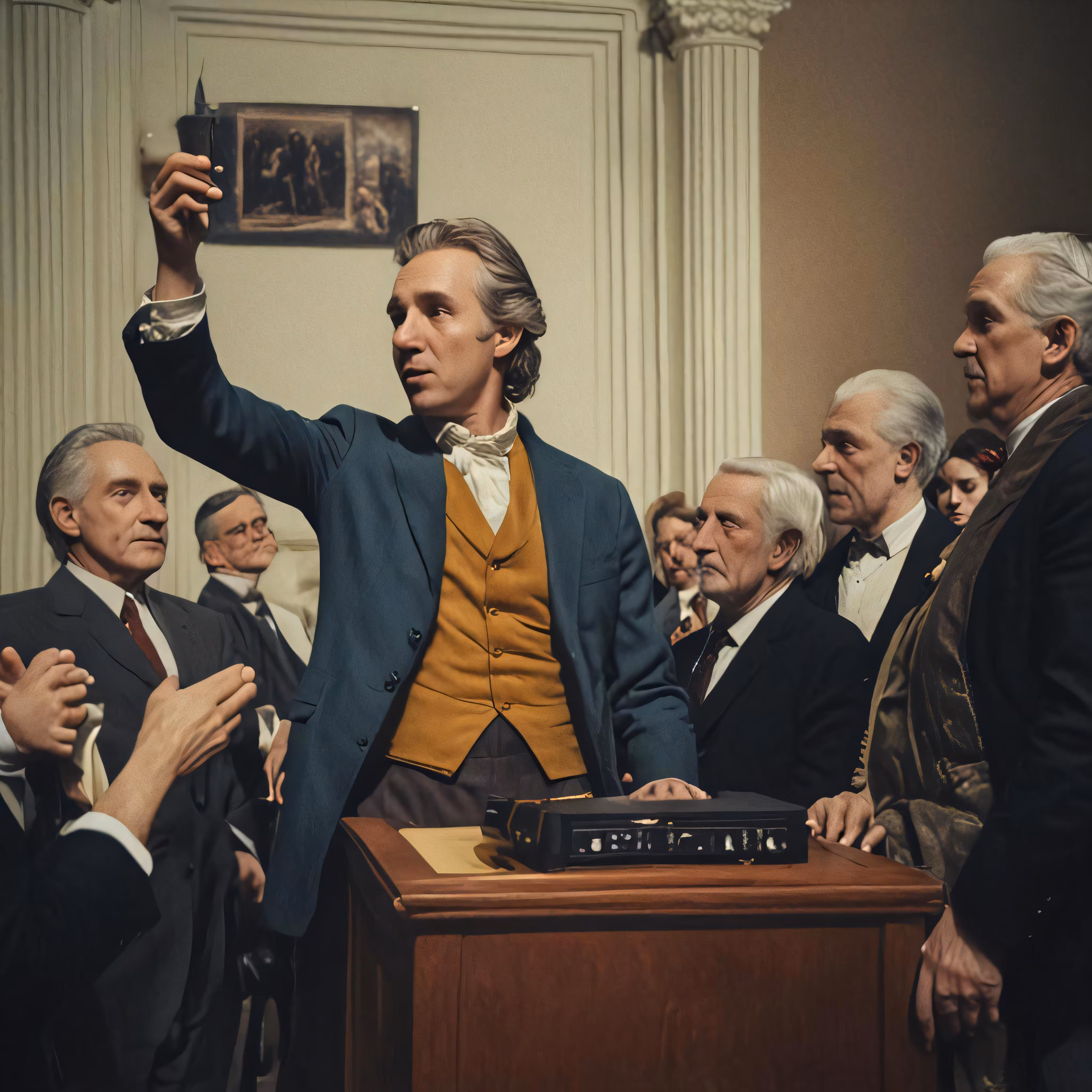 High resolution picture, free to use, the official logo for the 50 /a person at a table pointing his hand up
